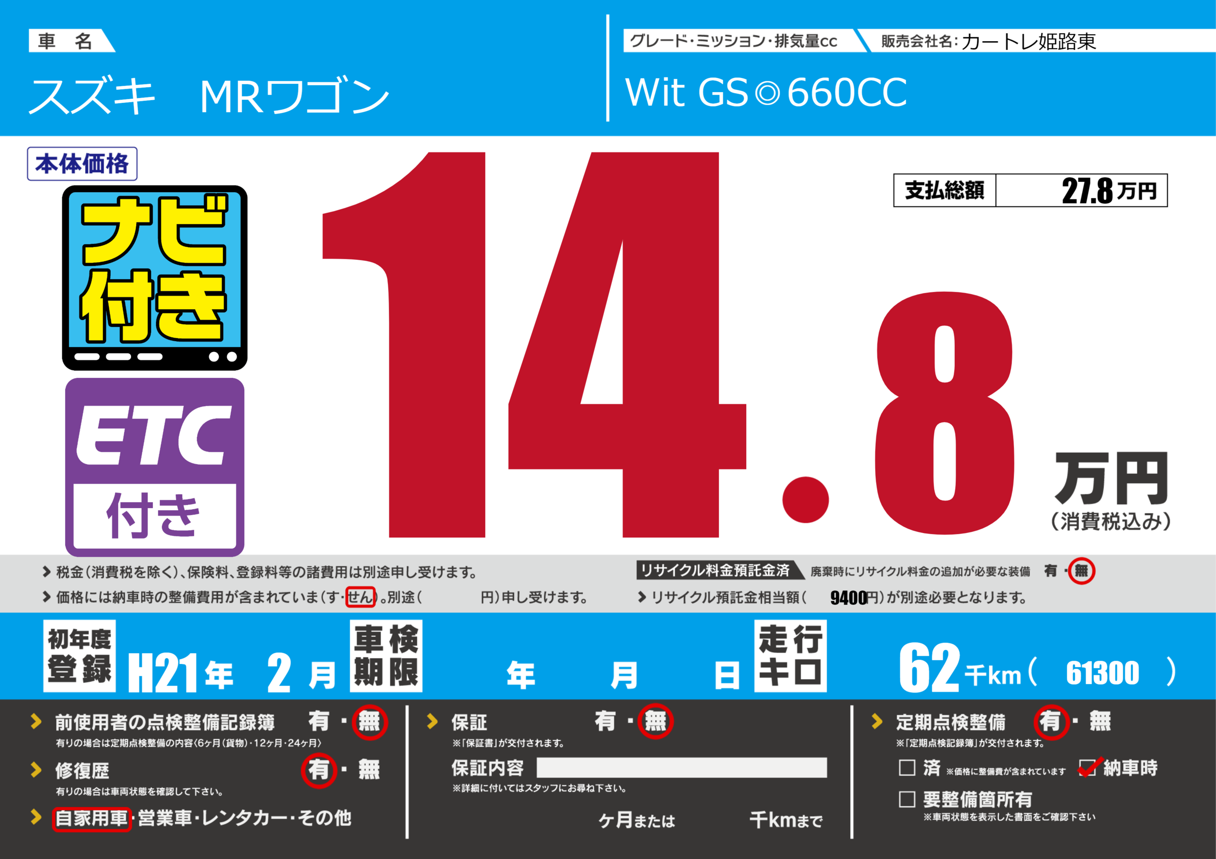 | 車名 | スズキ MRワゴン | グレード ミッション 排気量 |