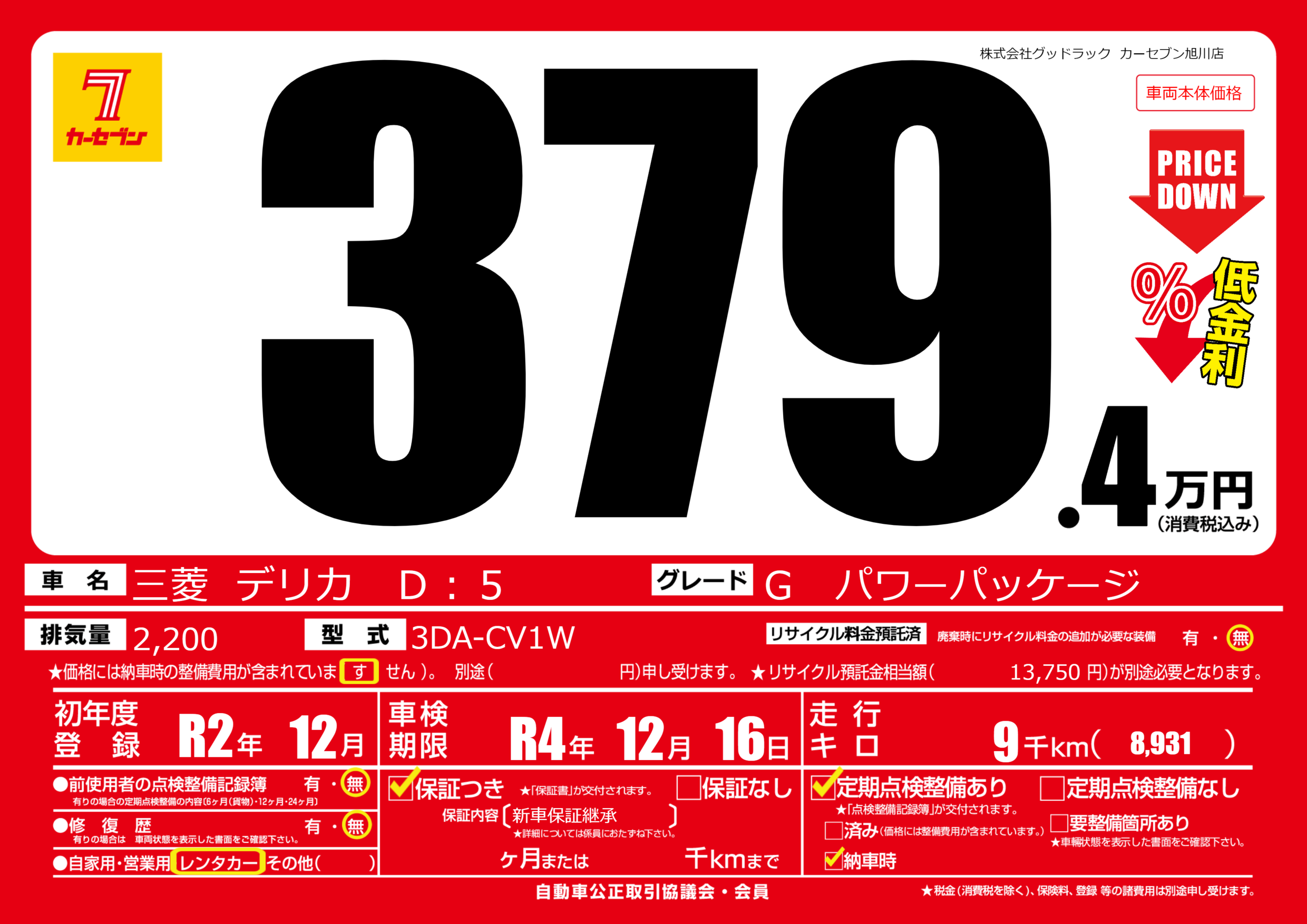 | 車名 | 三菱 デリカ D:5 | グレード ミッション 排気量 |