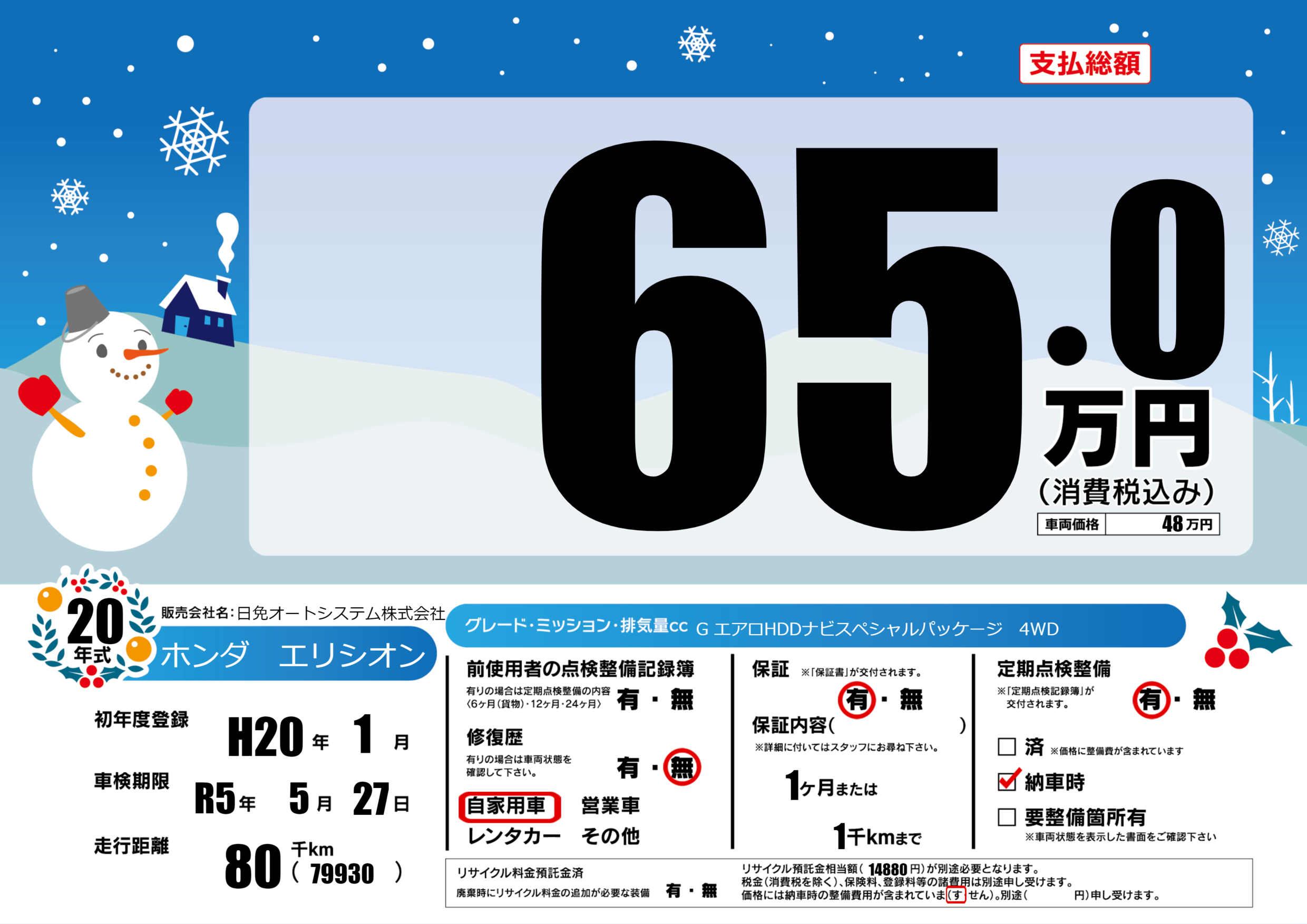 | 走行キロ | 8万km | 初年度登録 | H20年1月 |
