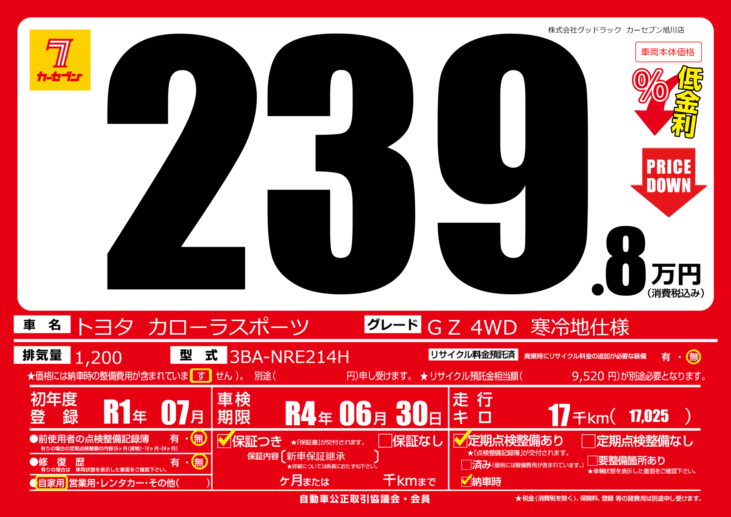 | 車名 | トヨタ カローラスポーツ | グレード ミッション 排気量 |