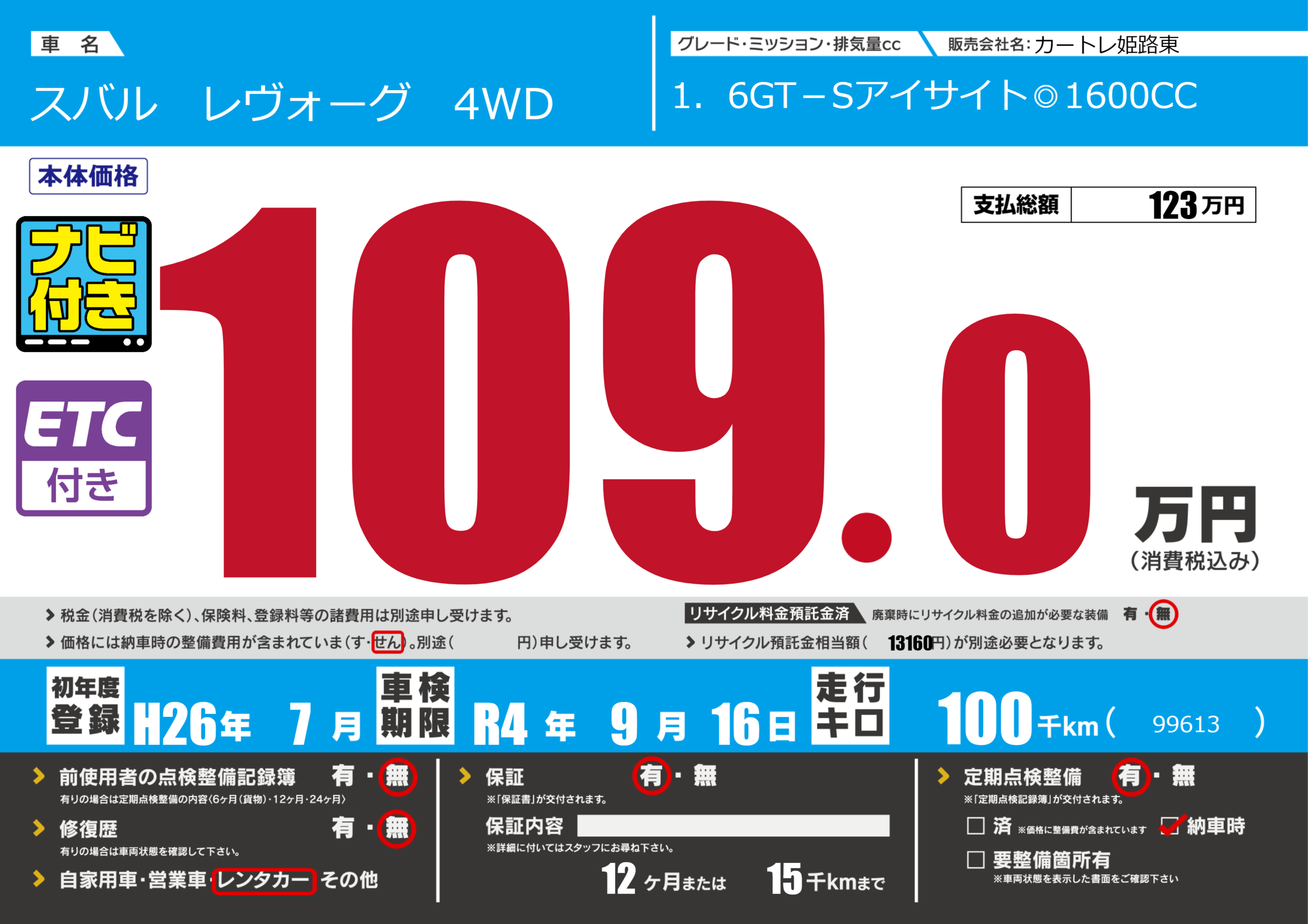なし | 車検制限 | R4年9月16月 |