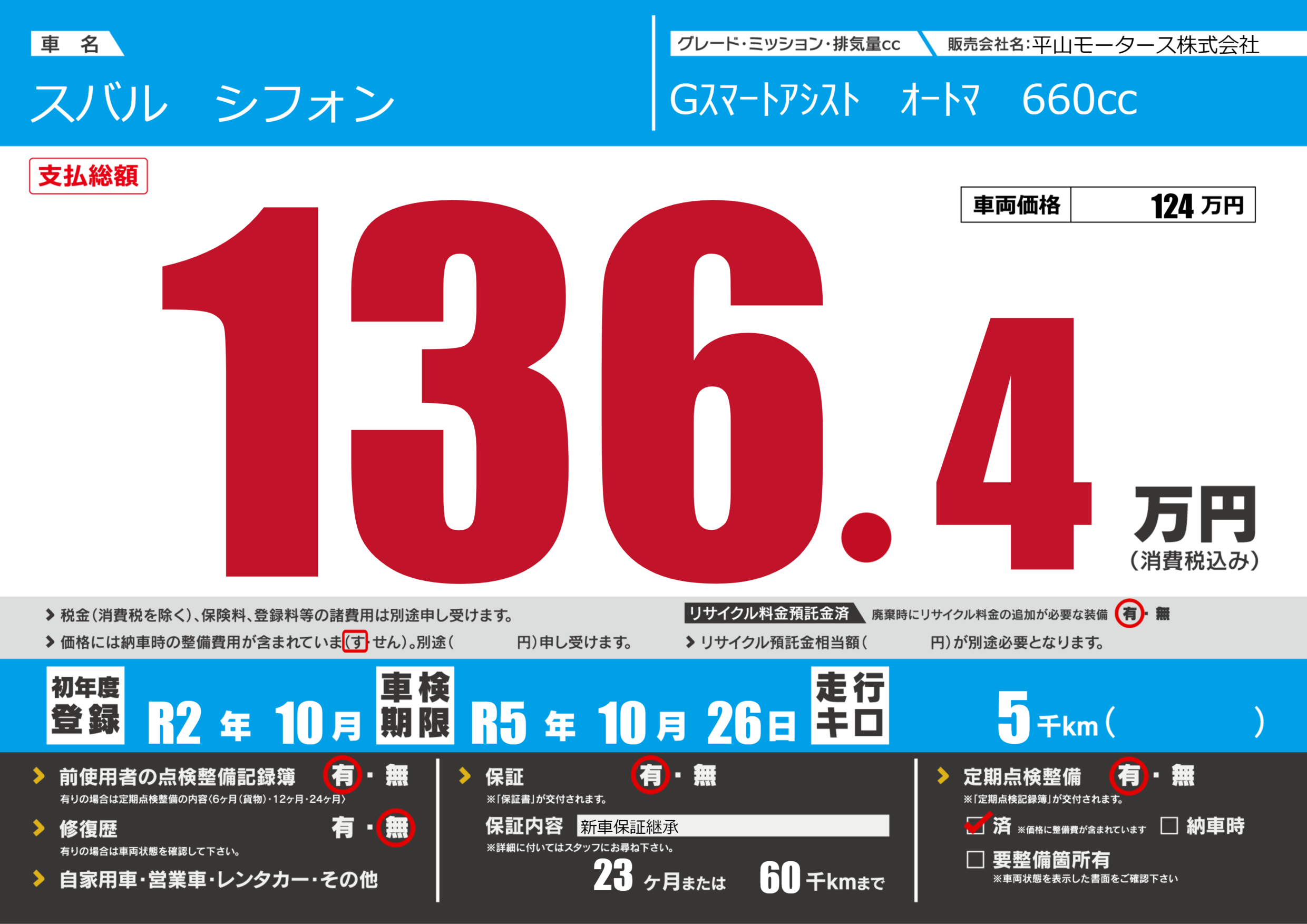 | 定期点検整備 | 定期点検整備あり 定期点検整備済み | ||