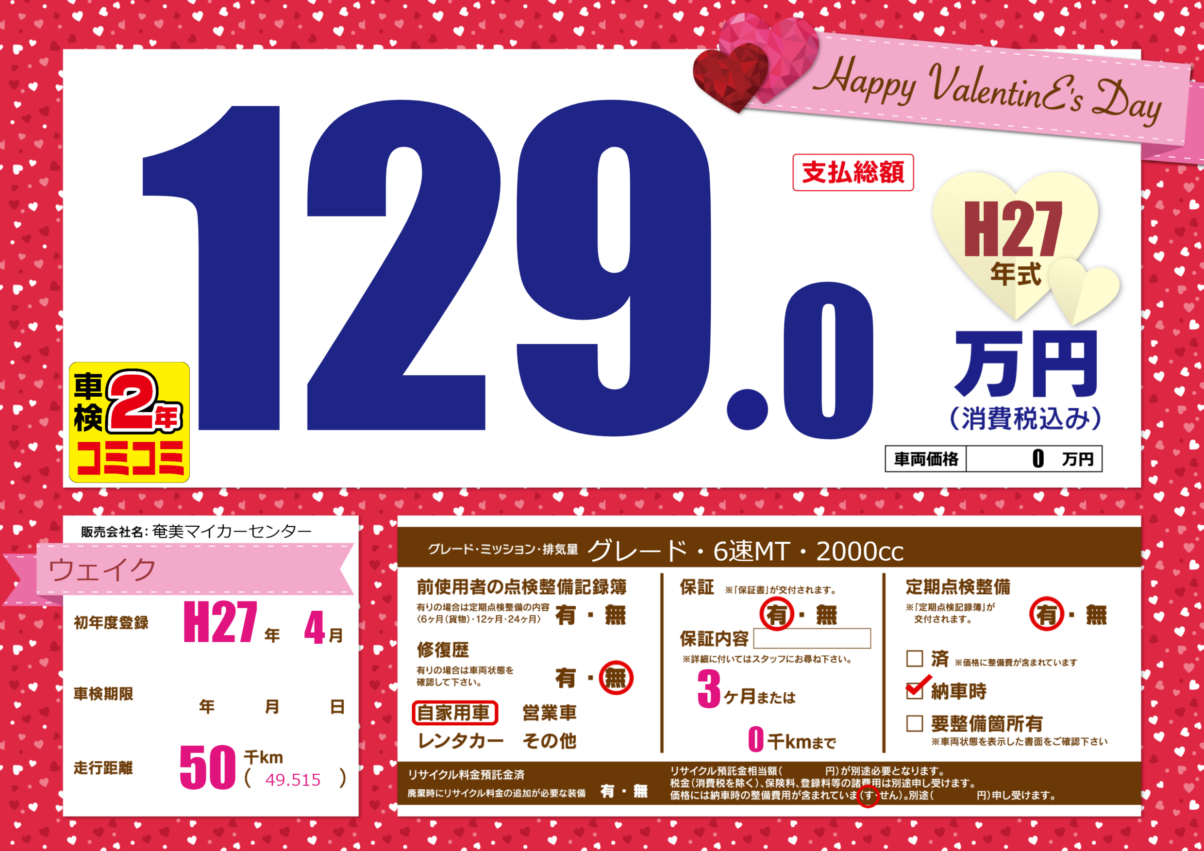 | 走行キロ | 5万km | 初年度登録 | H27年4月 |