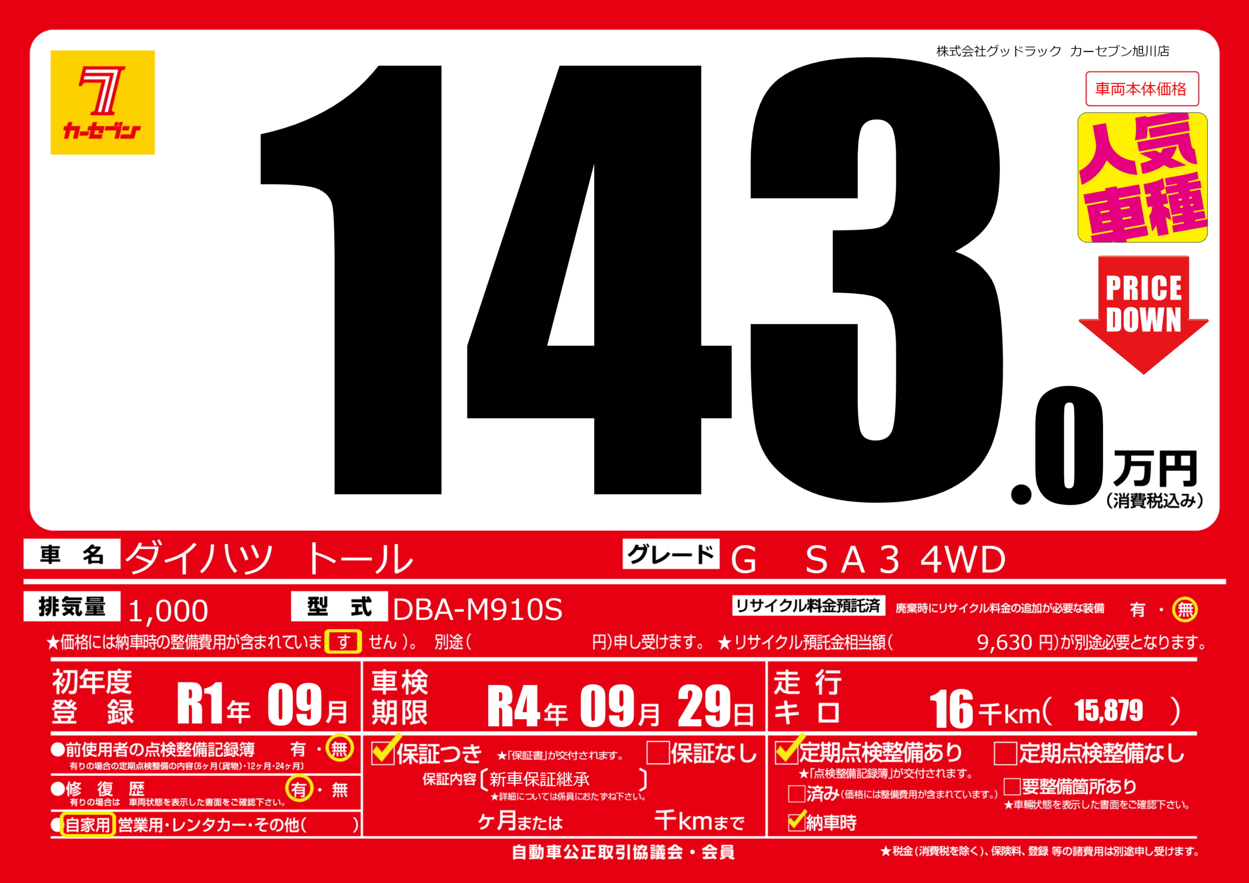 | 車名 | ダイハツ トール | グレード ミッション 排気量 |