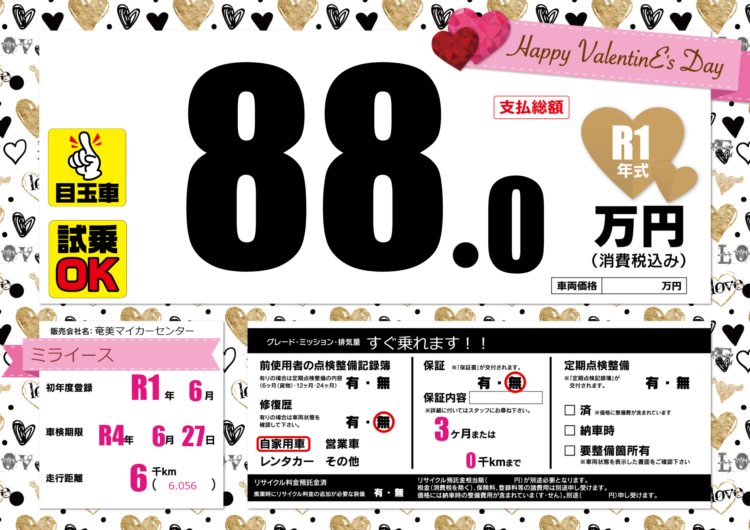 | 走行キロ | 0.6万km | 初年度登録 | R1年6月 |