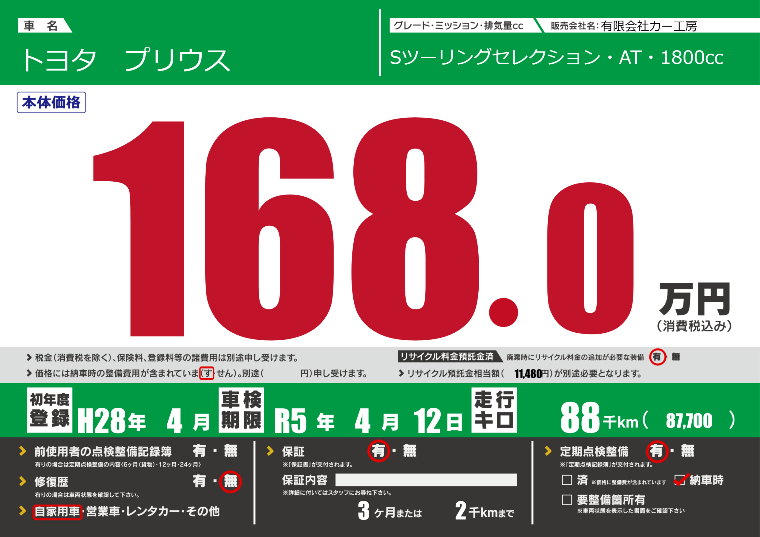 | 車名 | トヨタ プリウス | グレード ミッション 排気量 |