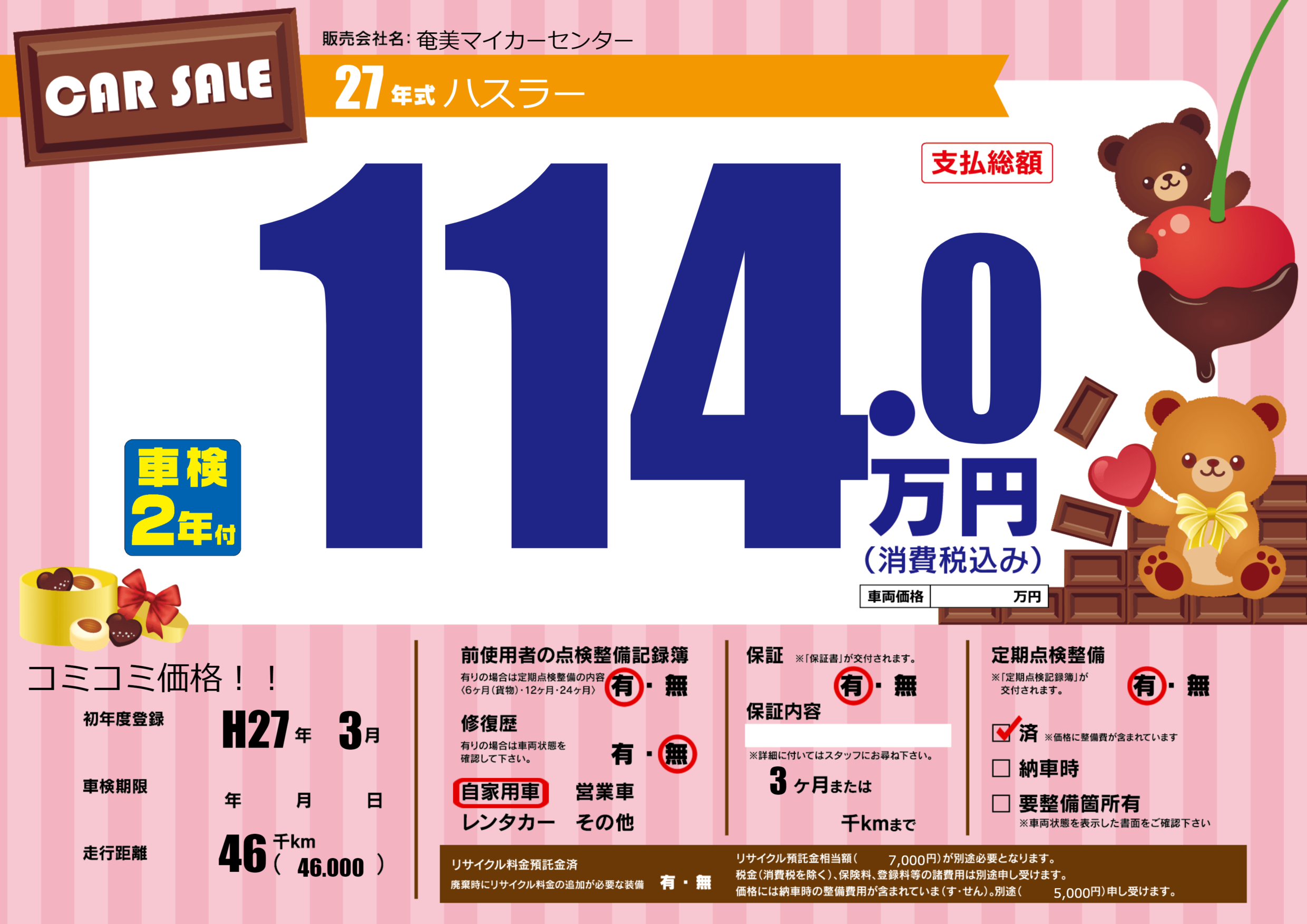 | 走行キロ | 4.6万km | 初年度登録 | H27年3月 |