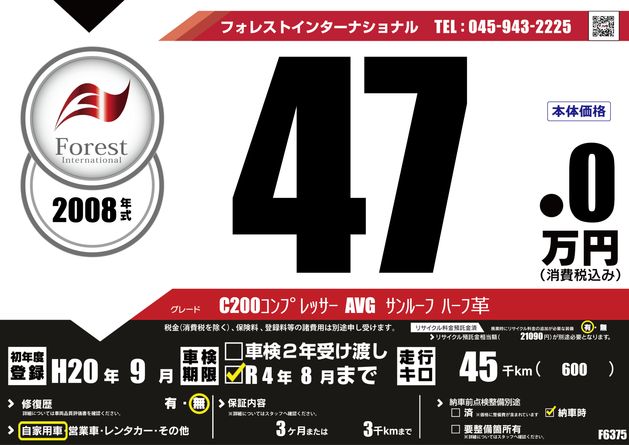 | 走行キロ | 4.5万km | 初年度登録 | H20年9月 |