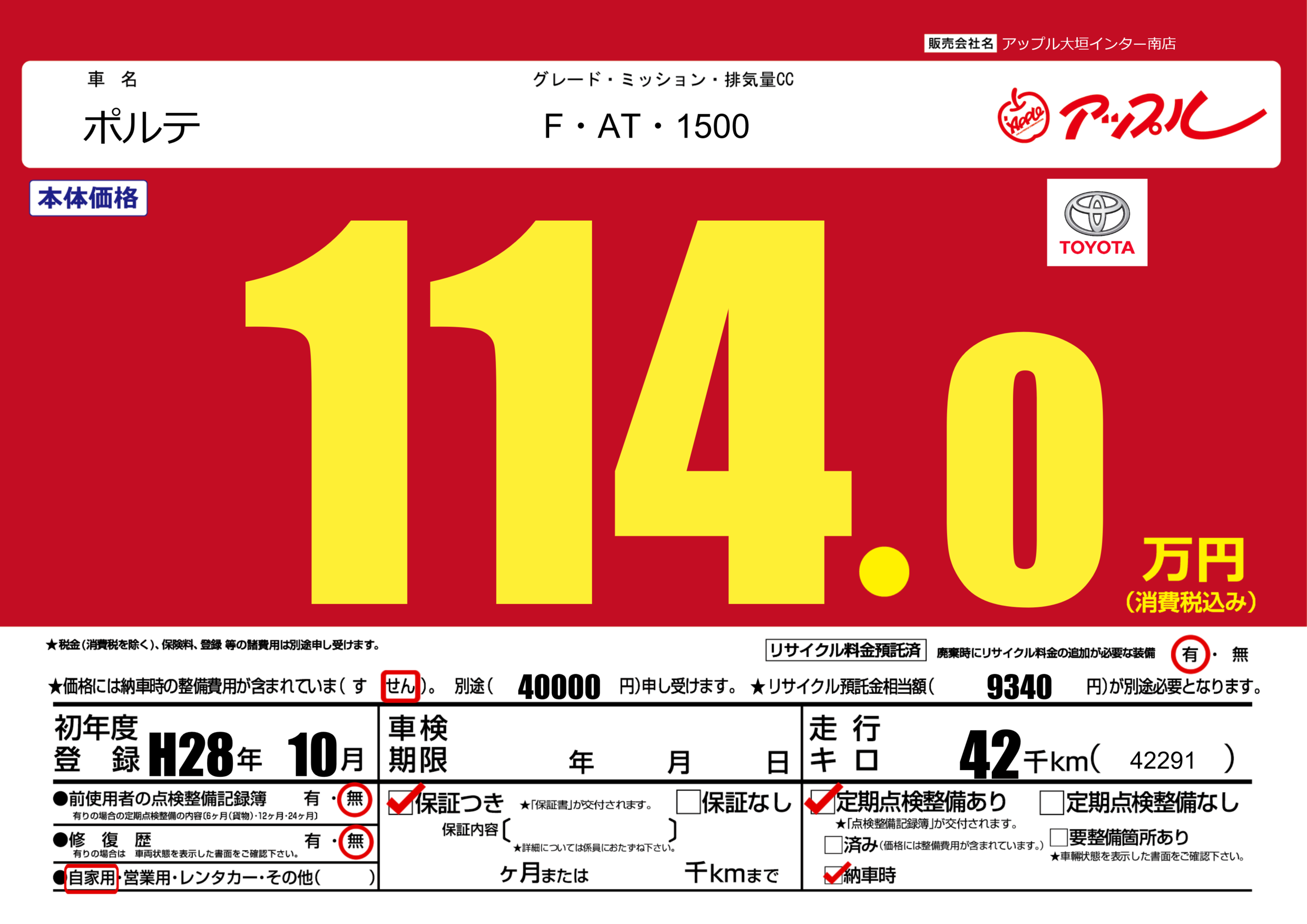 | 車名 | ポルテ | グレード ミッション 排気量 |