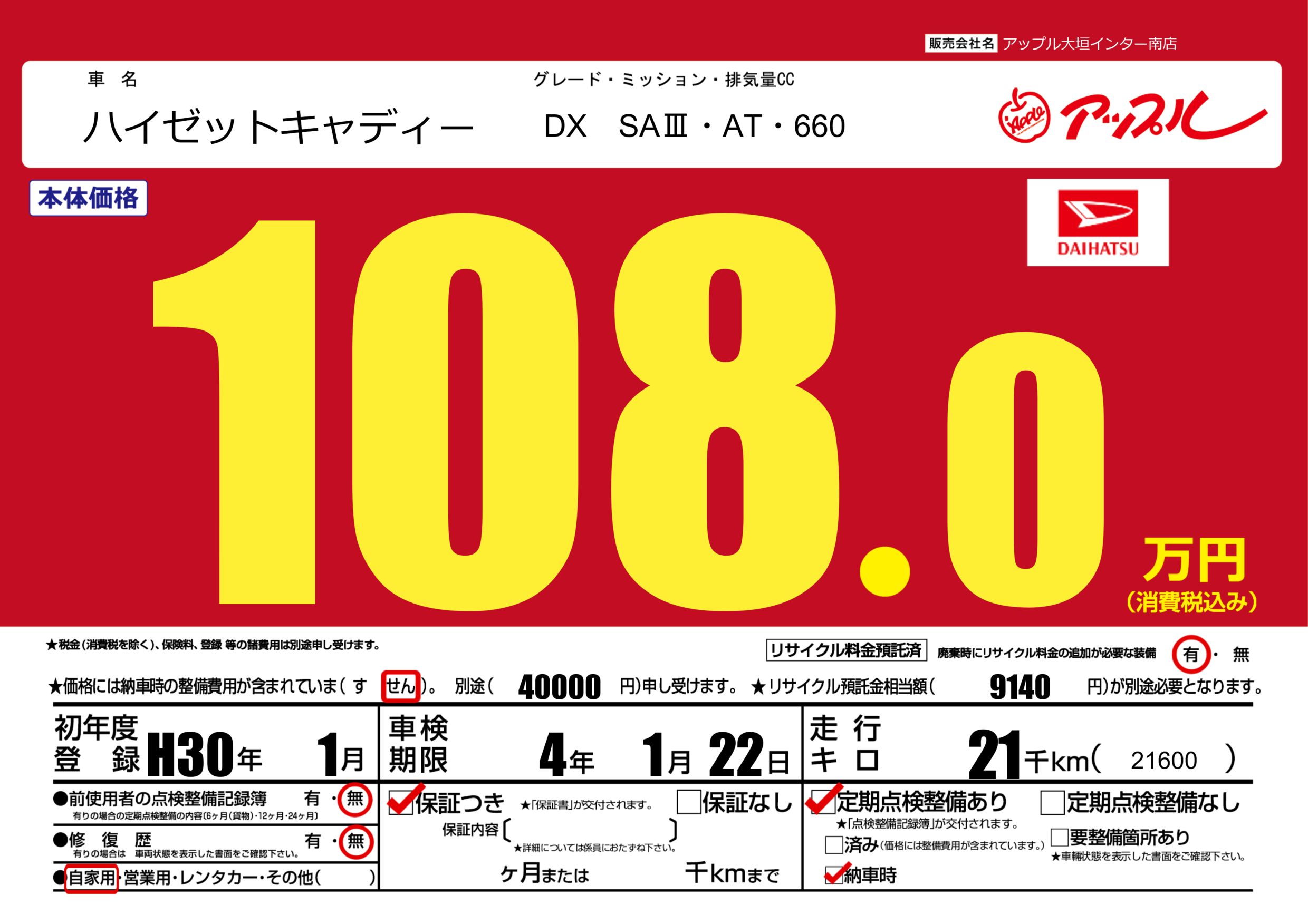 | 定期点検整備 | 定期点検整備あり 納車時あり | ||