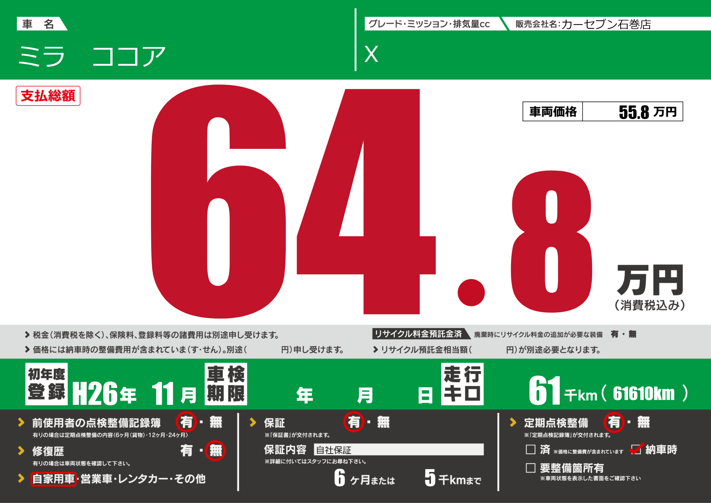 | 車名 | ミラ ココア | グレード ミッション 排気量 |