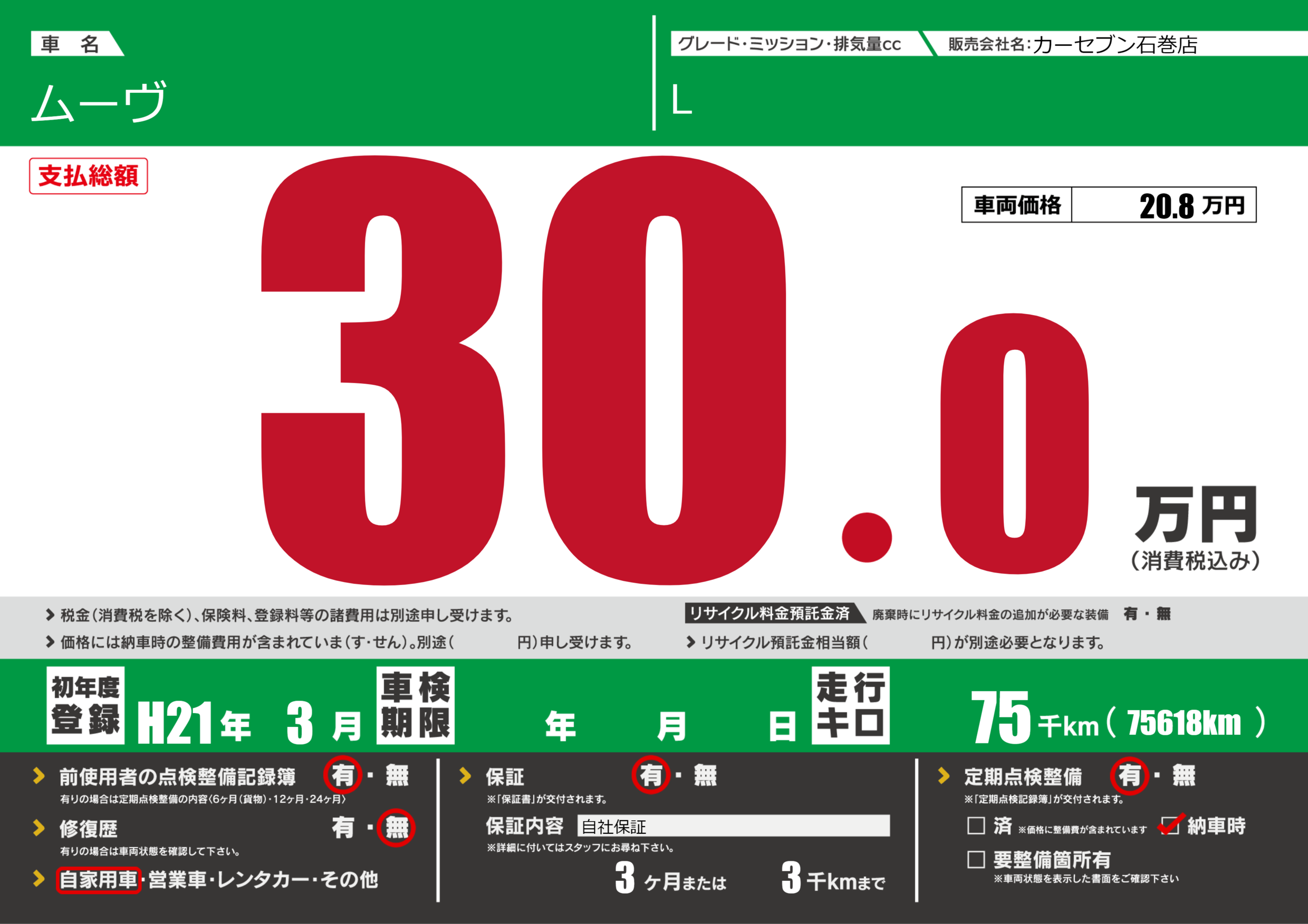 保証付き 保証内容(自社保証) 3ヶ月または3千km |