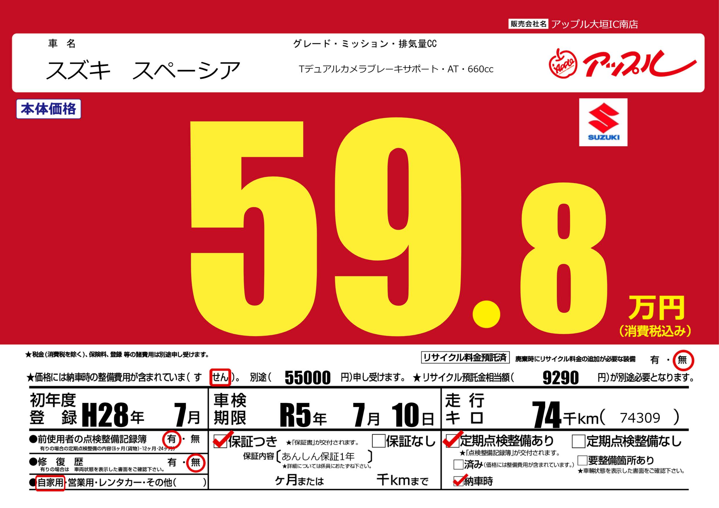 | 車名 | スズキ スペーシア | グレード ミッション 排気量 |