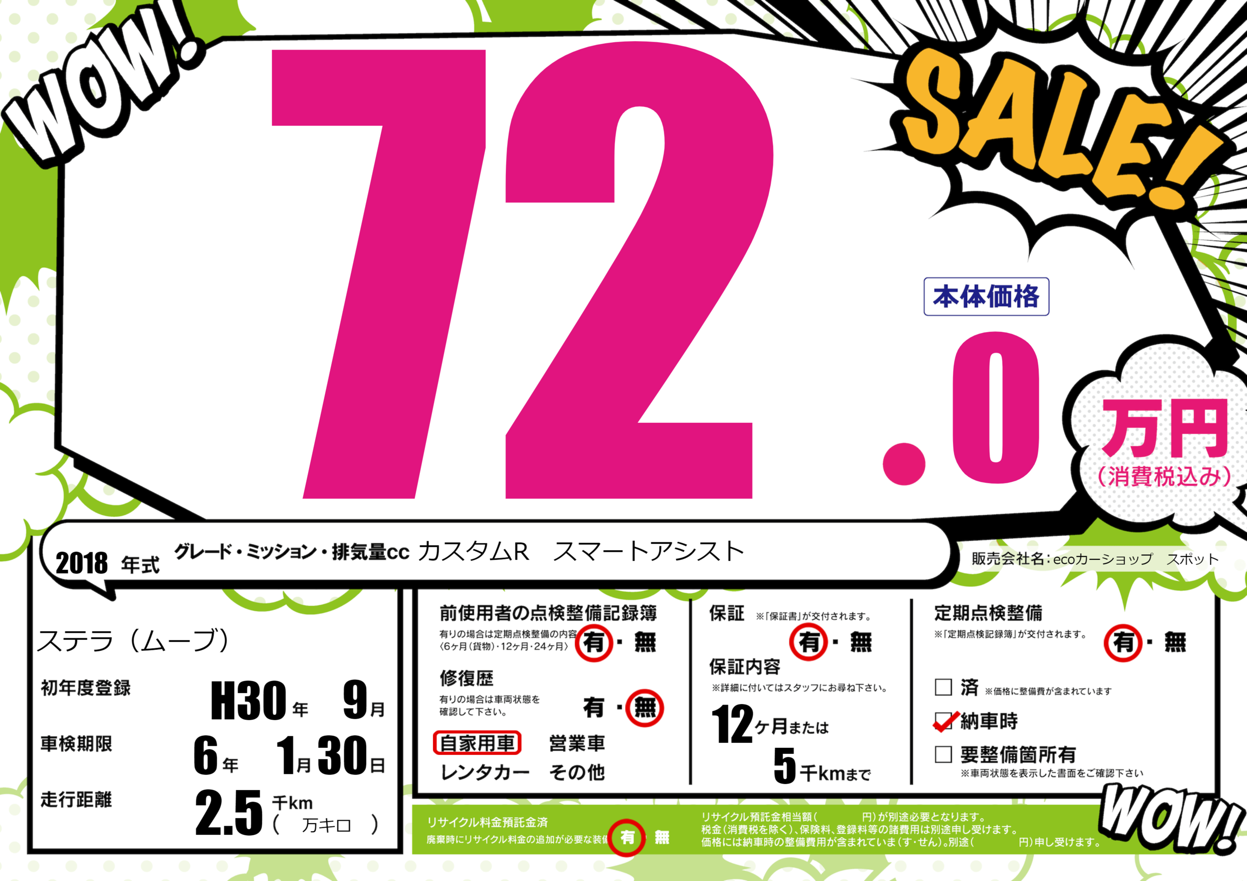 | 走行キロ | 0.2万km | 初年度登録 | H30年9月 |