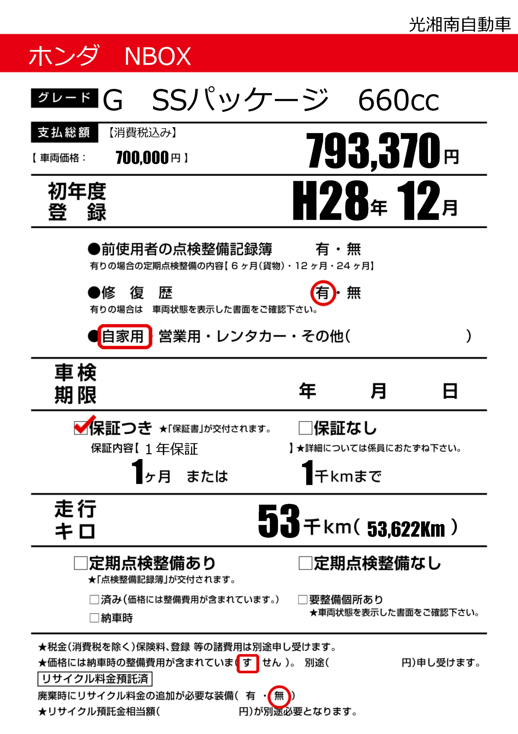 | 車名 | ホンダ NBOX | グレード ミッション 排気量 |