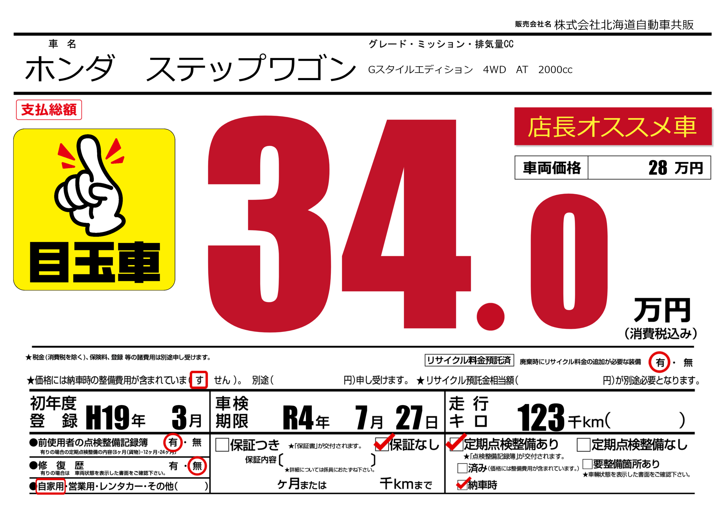 | 走行キロ | 12.3万km | 初年度登録 | H19年3月 |
