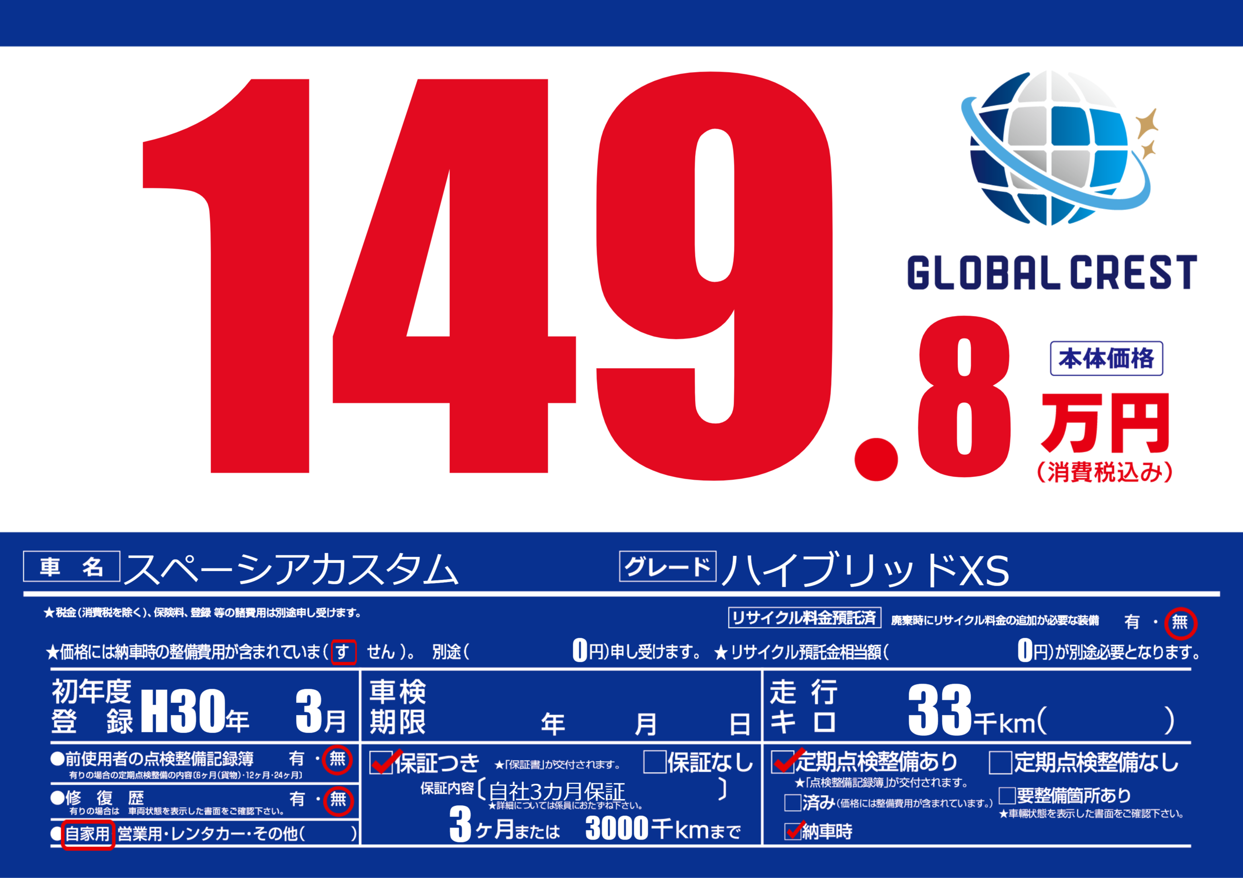 | 走行キロ | 3.3万km | 初年度登録 | H30年3月 |