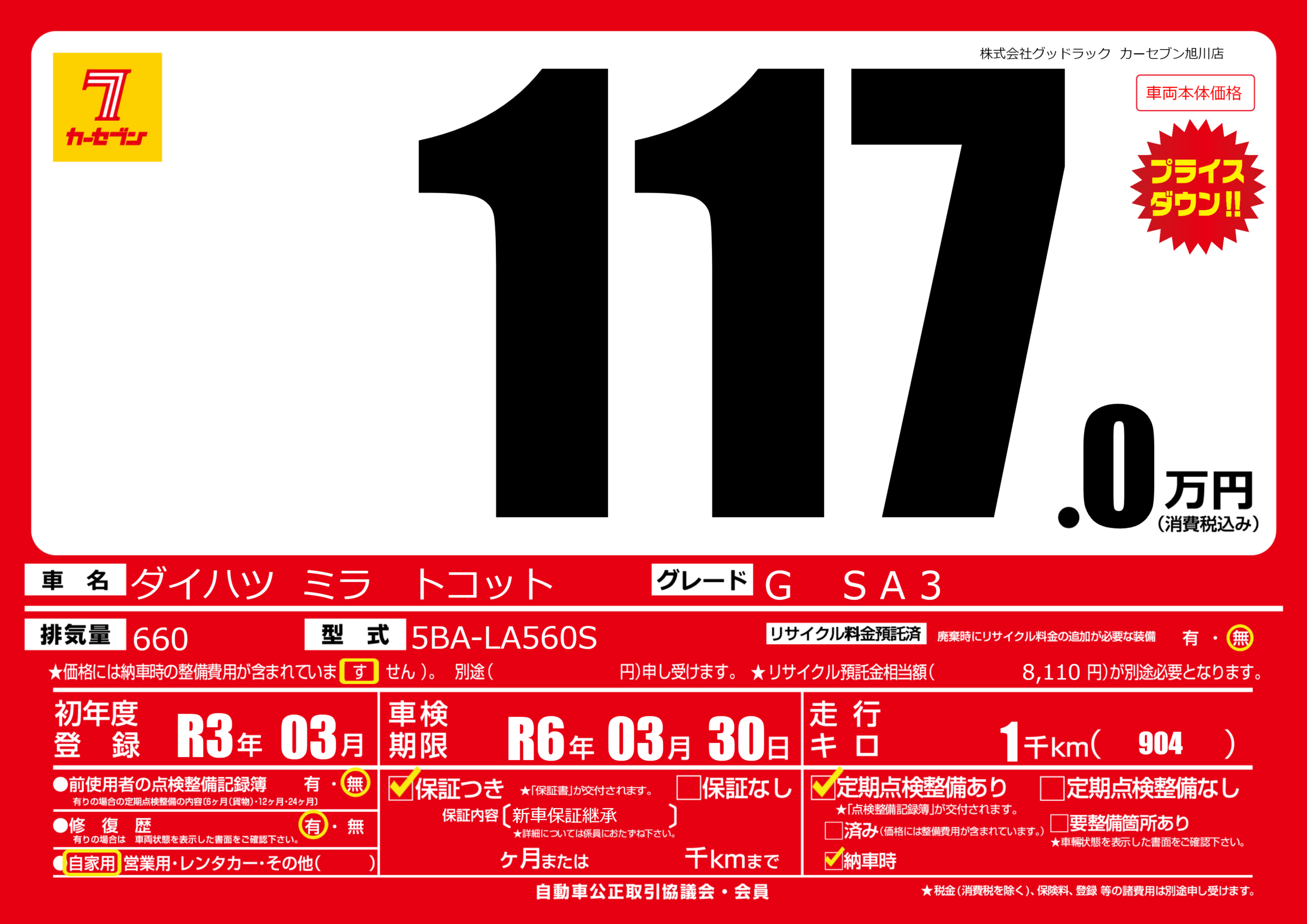 | 車名 | ダイハツ ミラ トコット | グレード ミッション 排気量 |