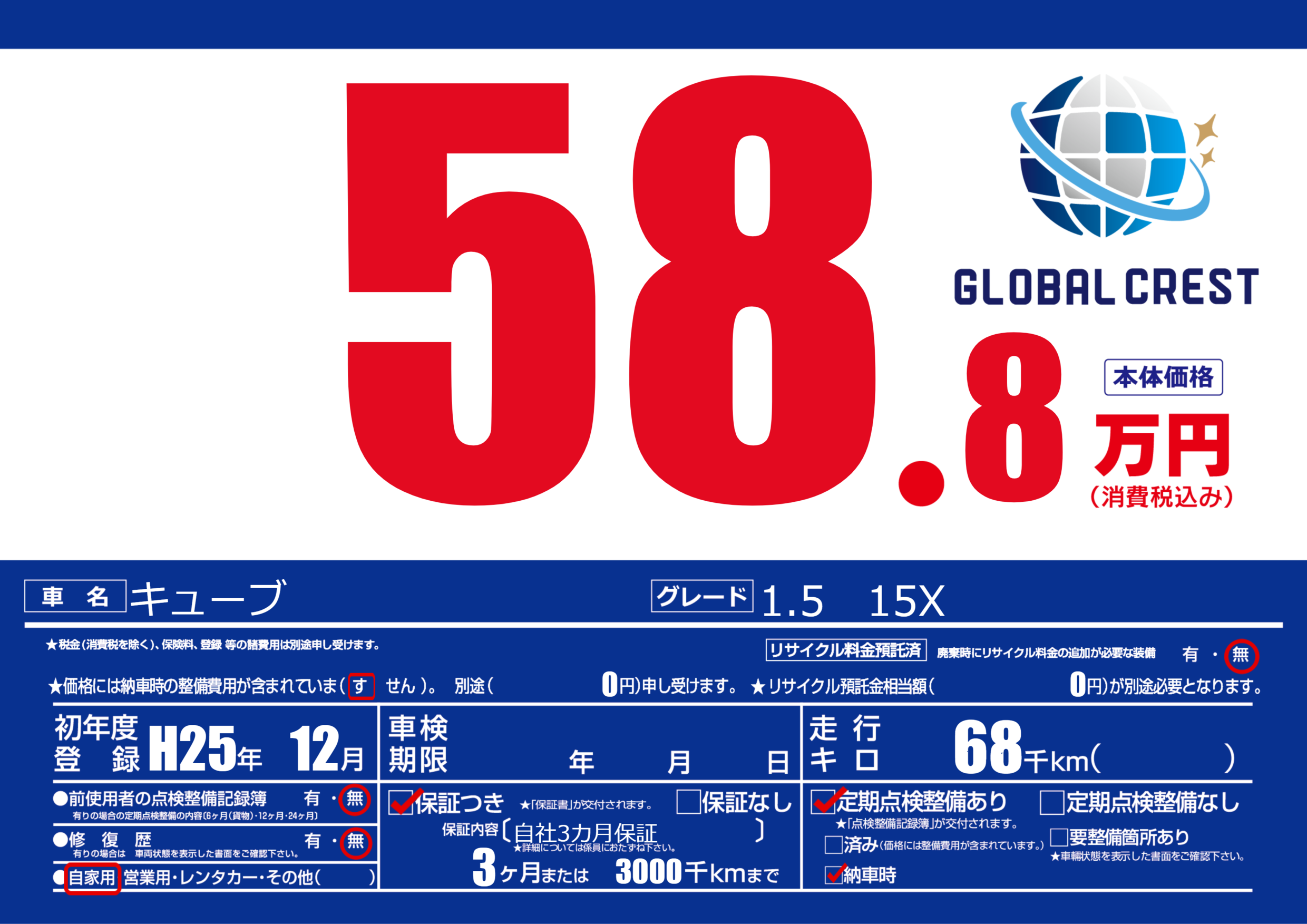 | 車名 | キューブ | グレード ミッション 排気量 |