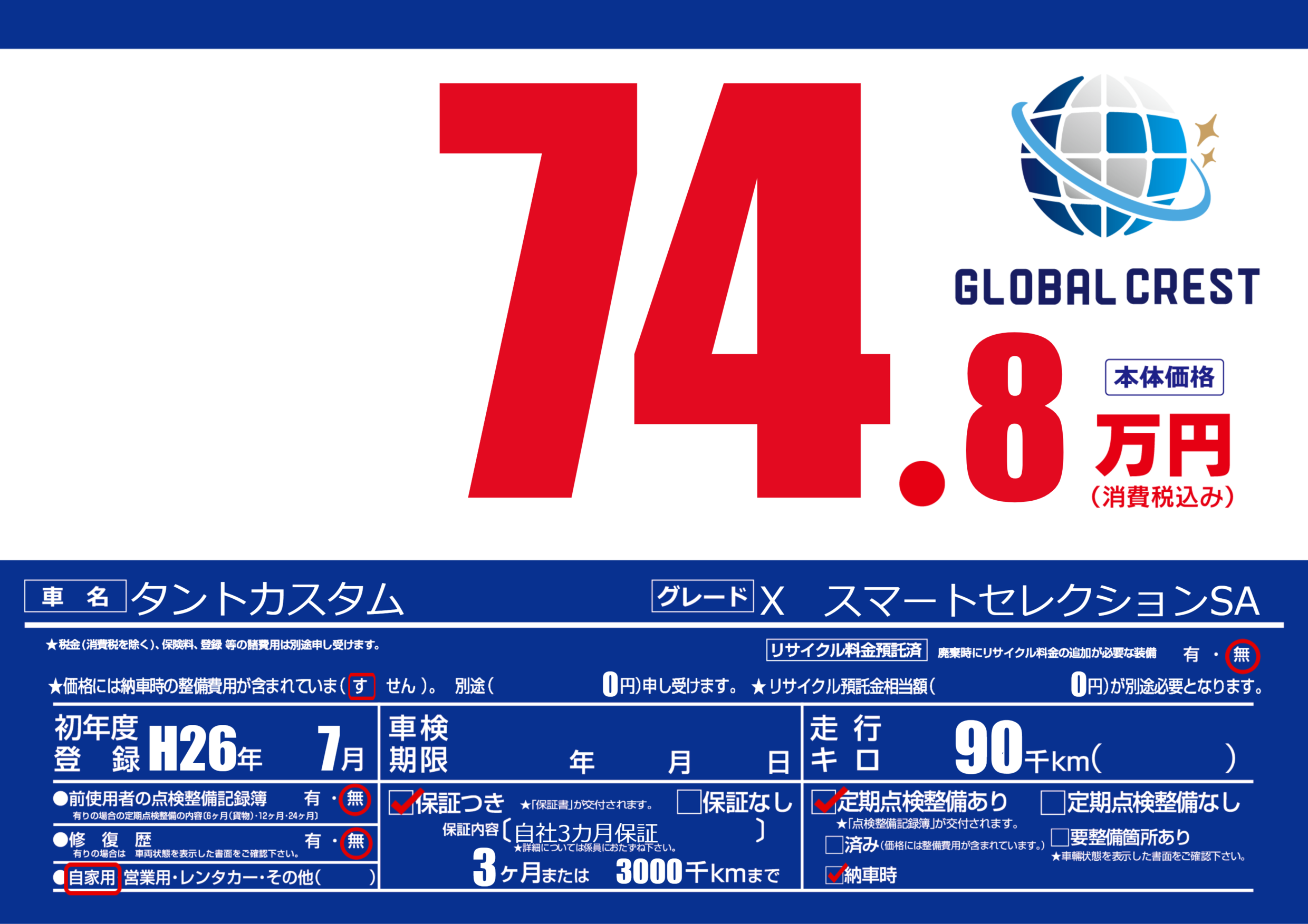 | 走行キロ | 9万km | 初年度登録 | H26年7月 |