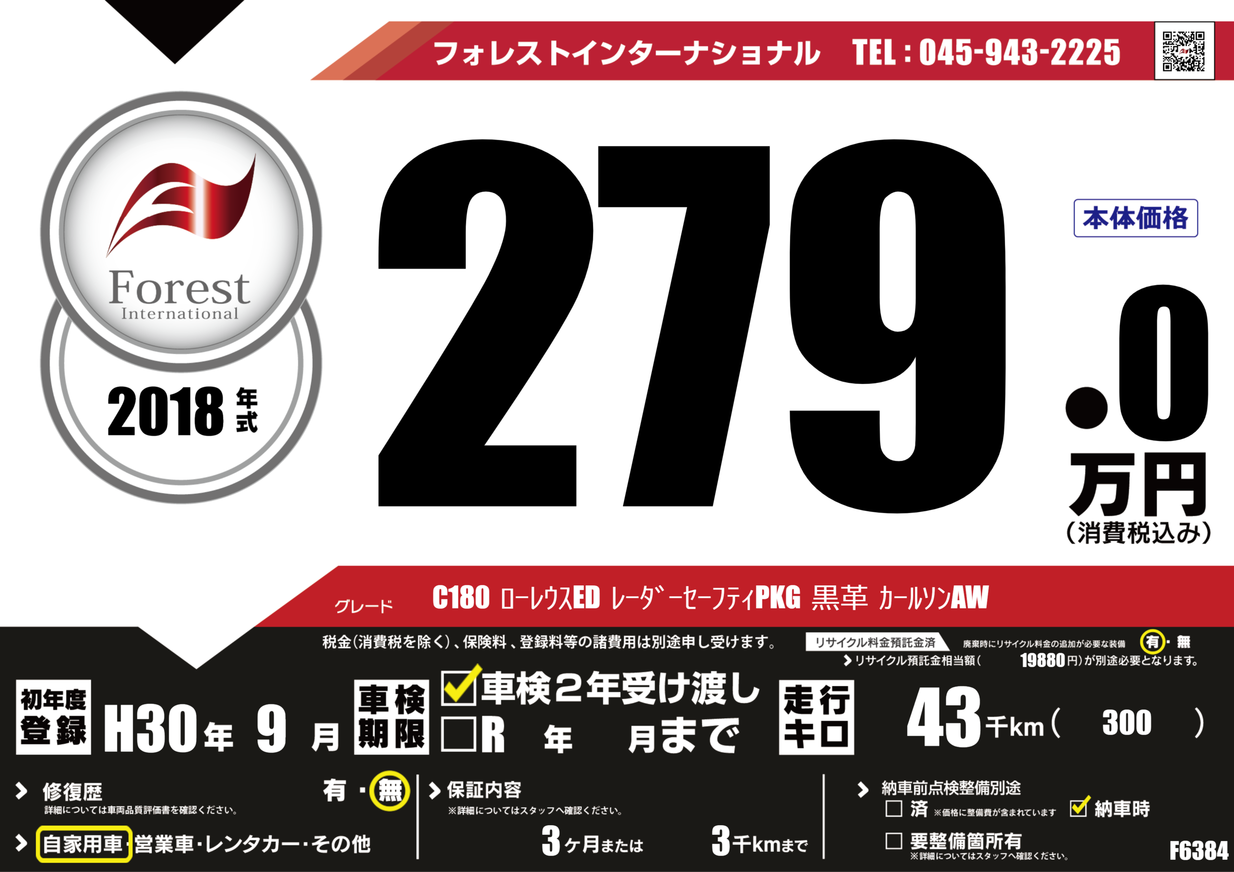 | 走行キロ | 4.3万km | 初年度登録 | H30年9月 |