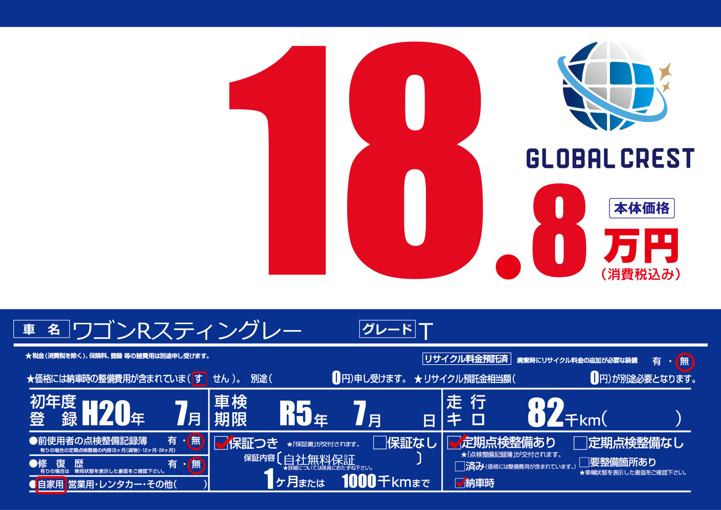 | 走行キロ | 8.2万km | 初年度登録 | H20年7月 |