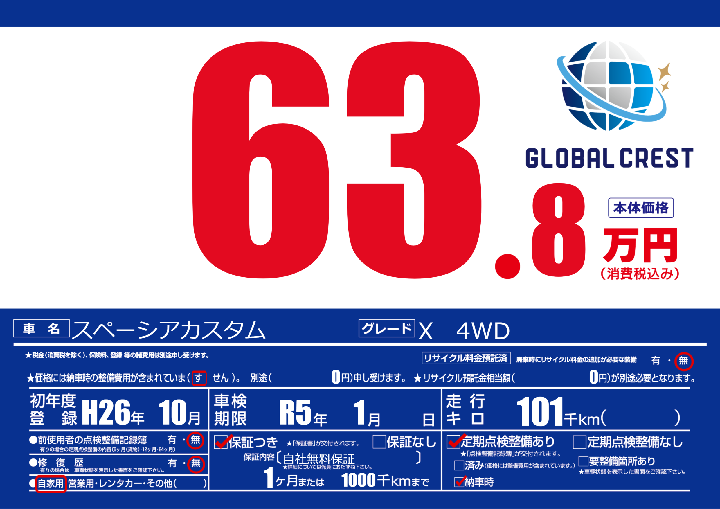 | 車名 | スペーシアカスタム | グレード ミッション 排気量 |