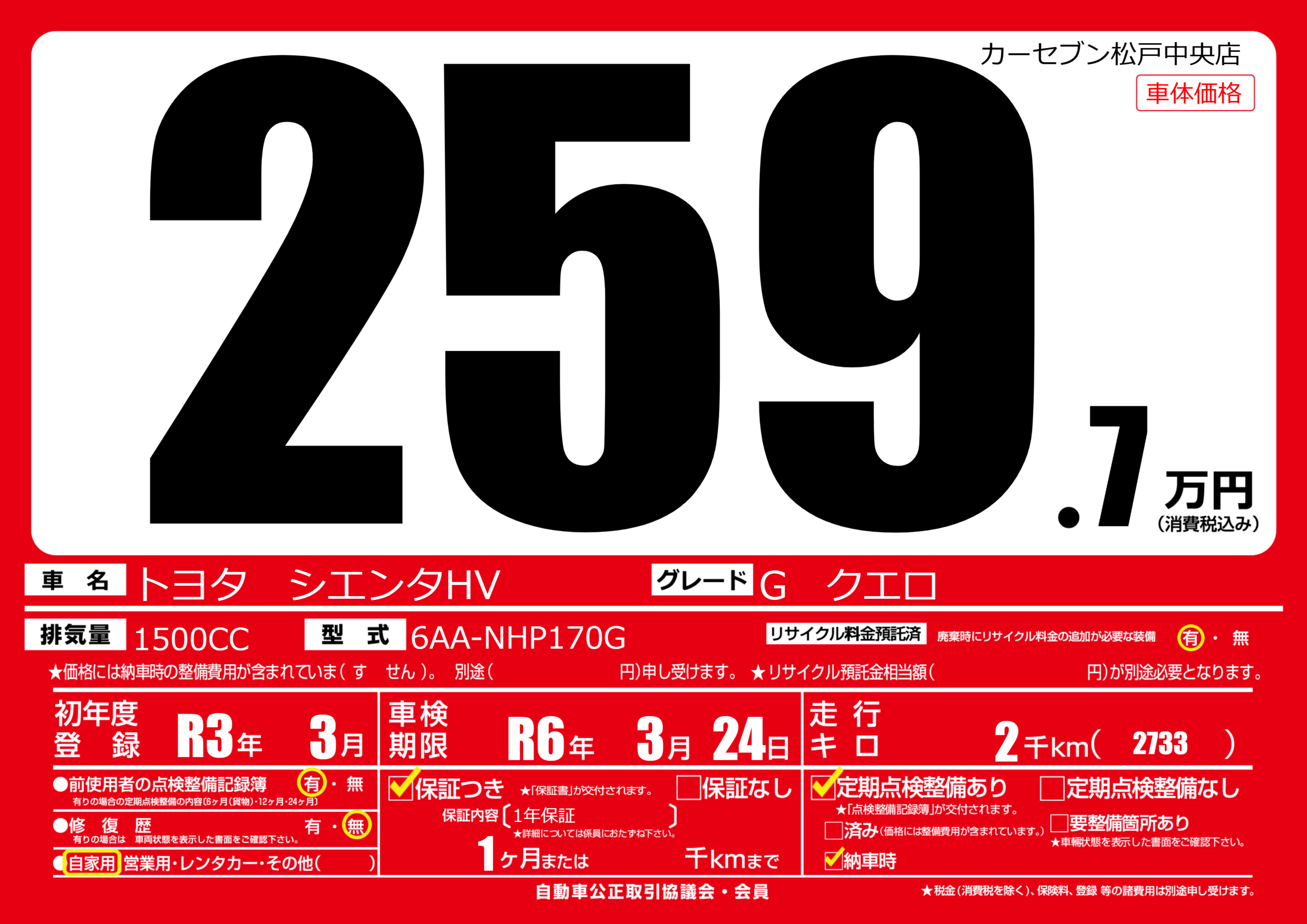 | 車名 | トヨタ シエンタHV | グレード ミッション 排気量 |