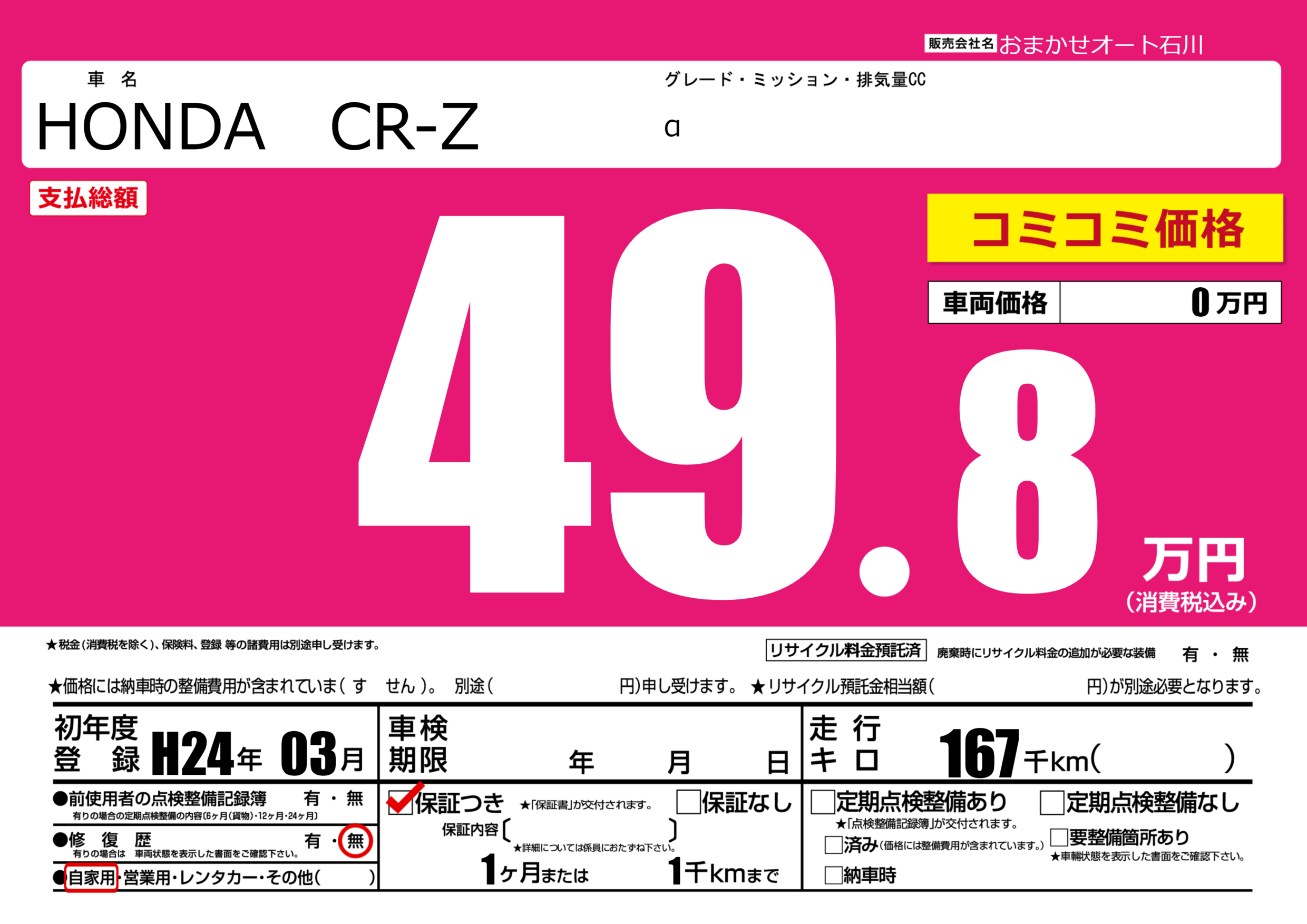 | 車名 | HONDA CR-Z | グレード ミッション 排気量 |