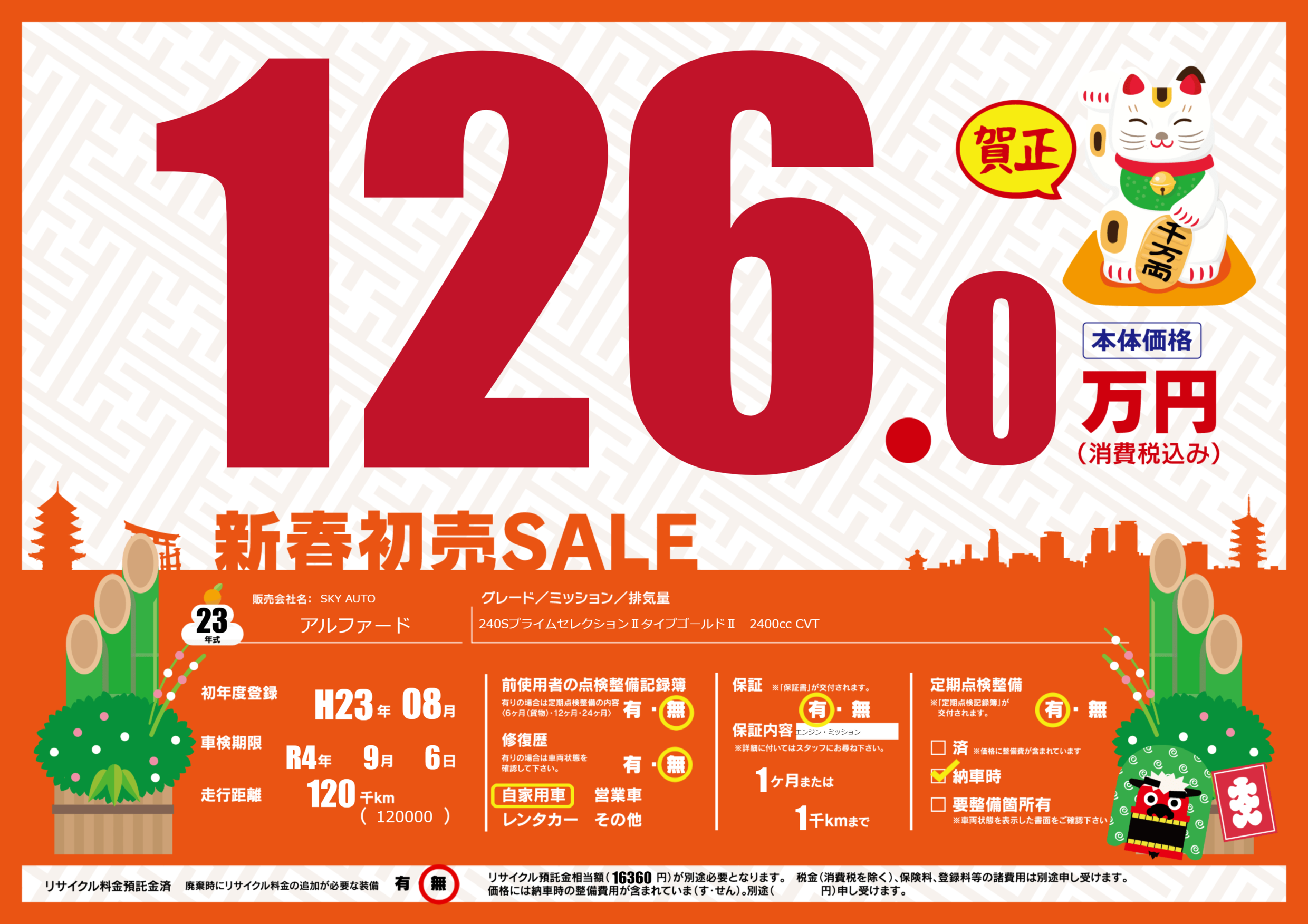 | 走行キロ | 12万km | 初年度登録 | H23年08月 |