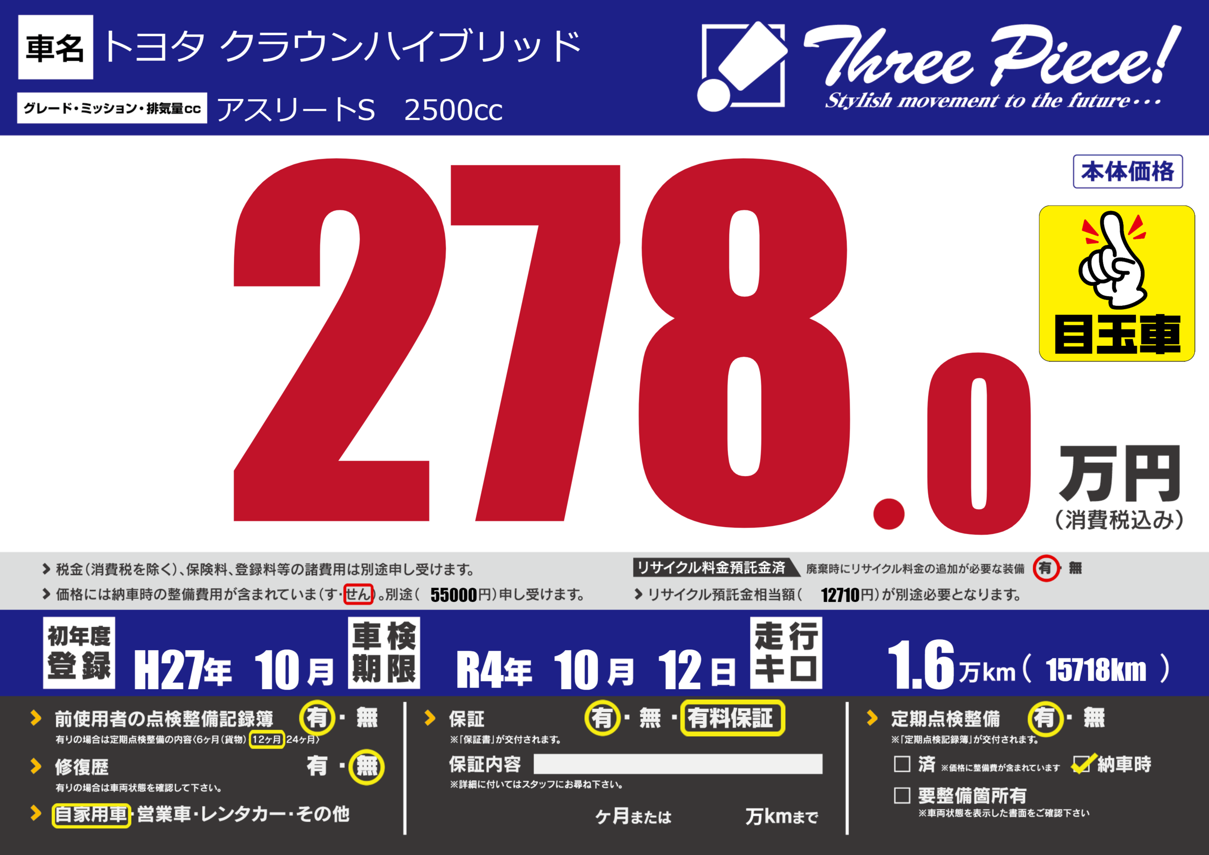 | 車名 | トヨタ クラウンハイブリッド | グレード ミッション 排気量 |