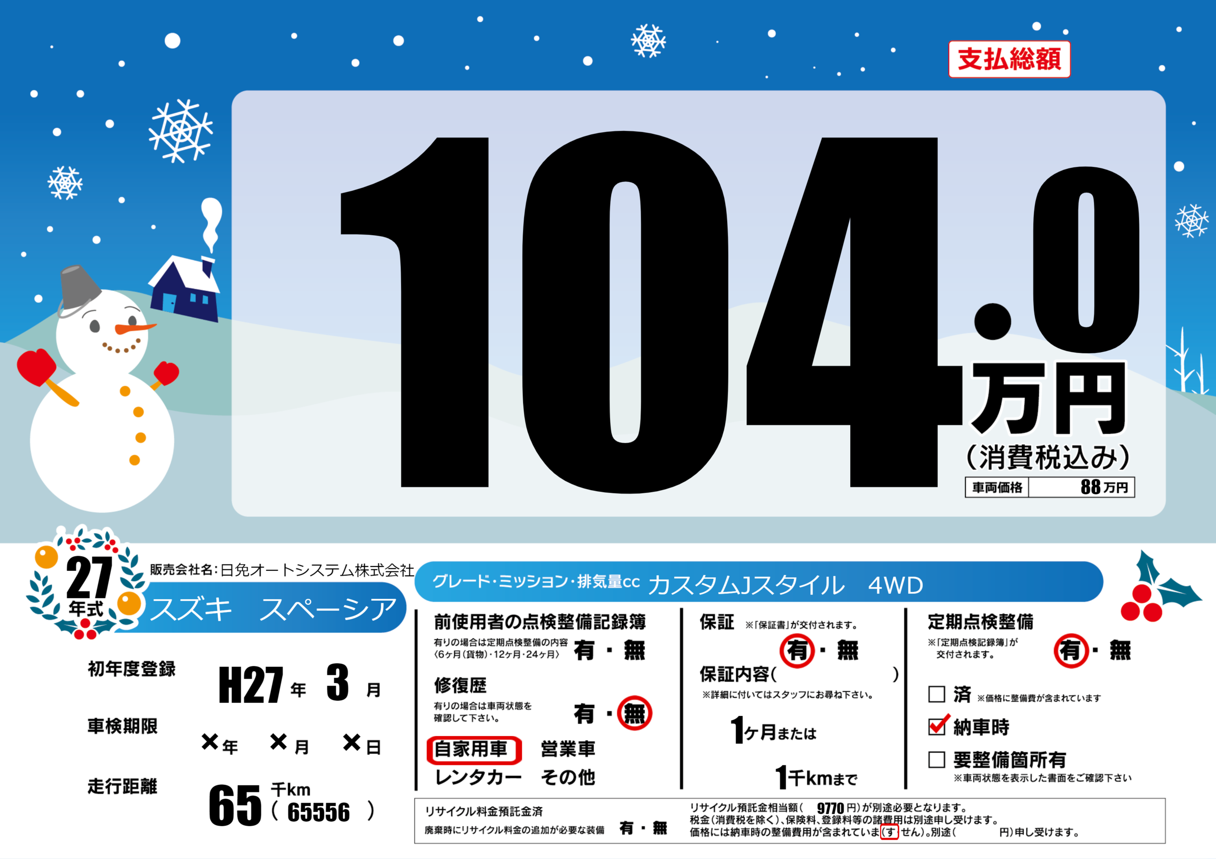 | 定期点検整備 | 定期点検整備あり 納車時あり | ||