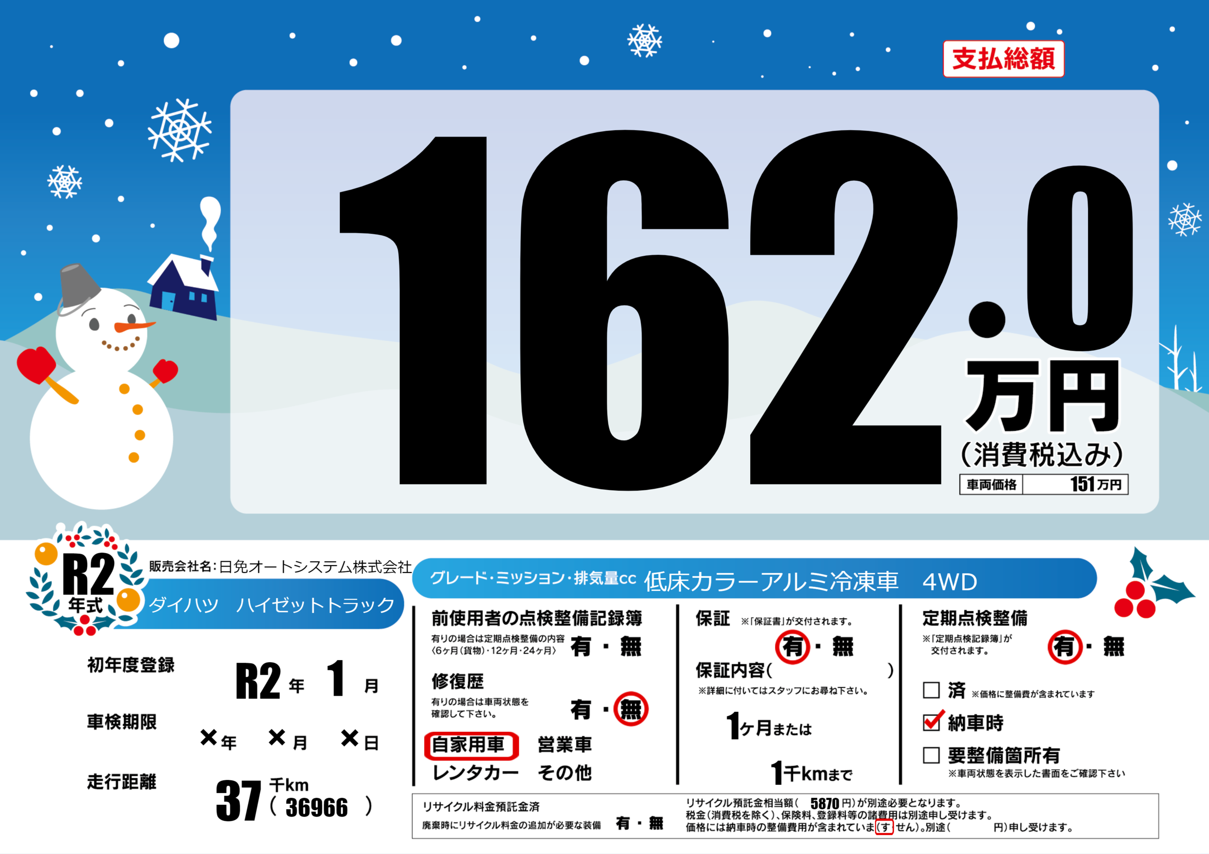 | 定期点検整備 | 定期点検整備あり 納車時あり | ||