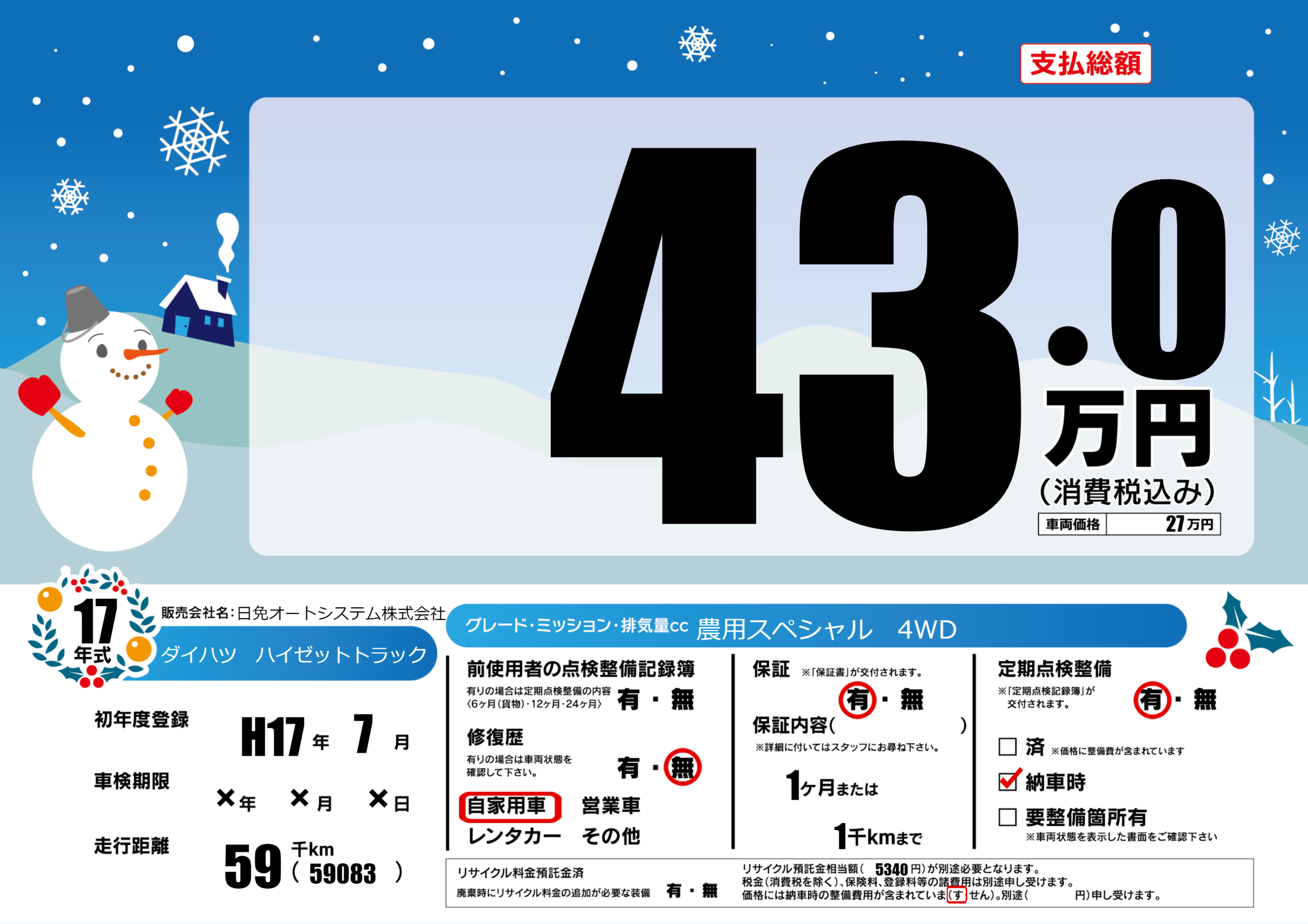 | 車名 | ダイハツ ハイゼットトラック | グレード ミッション 排気量 |