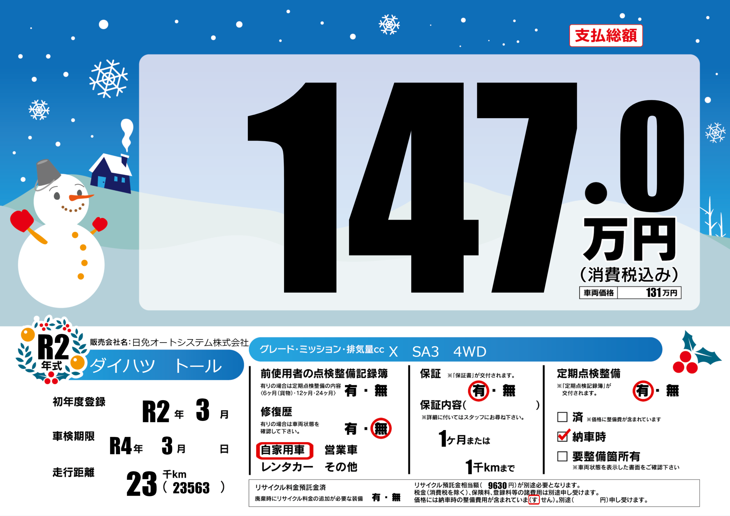 | 車検制限 | R4年 3月 - 日 | ||