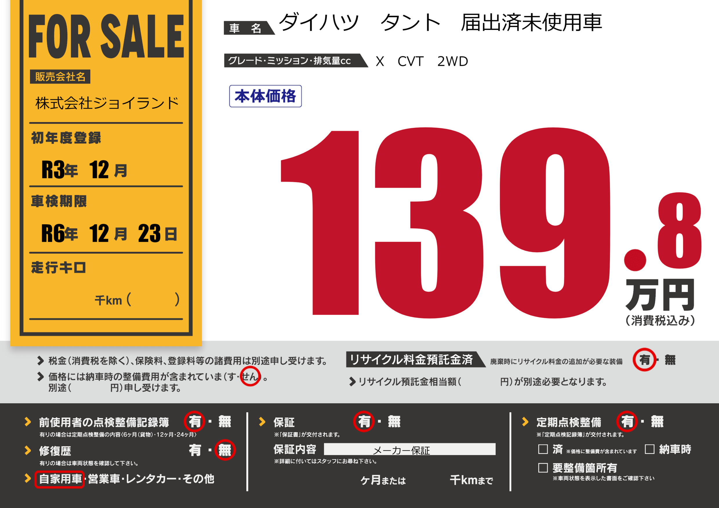 | 車名 | ダイハツ タント 届出済未使用車 | グレード ミッション 排気量 |