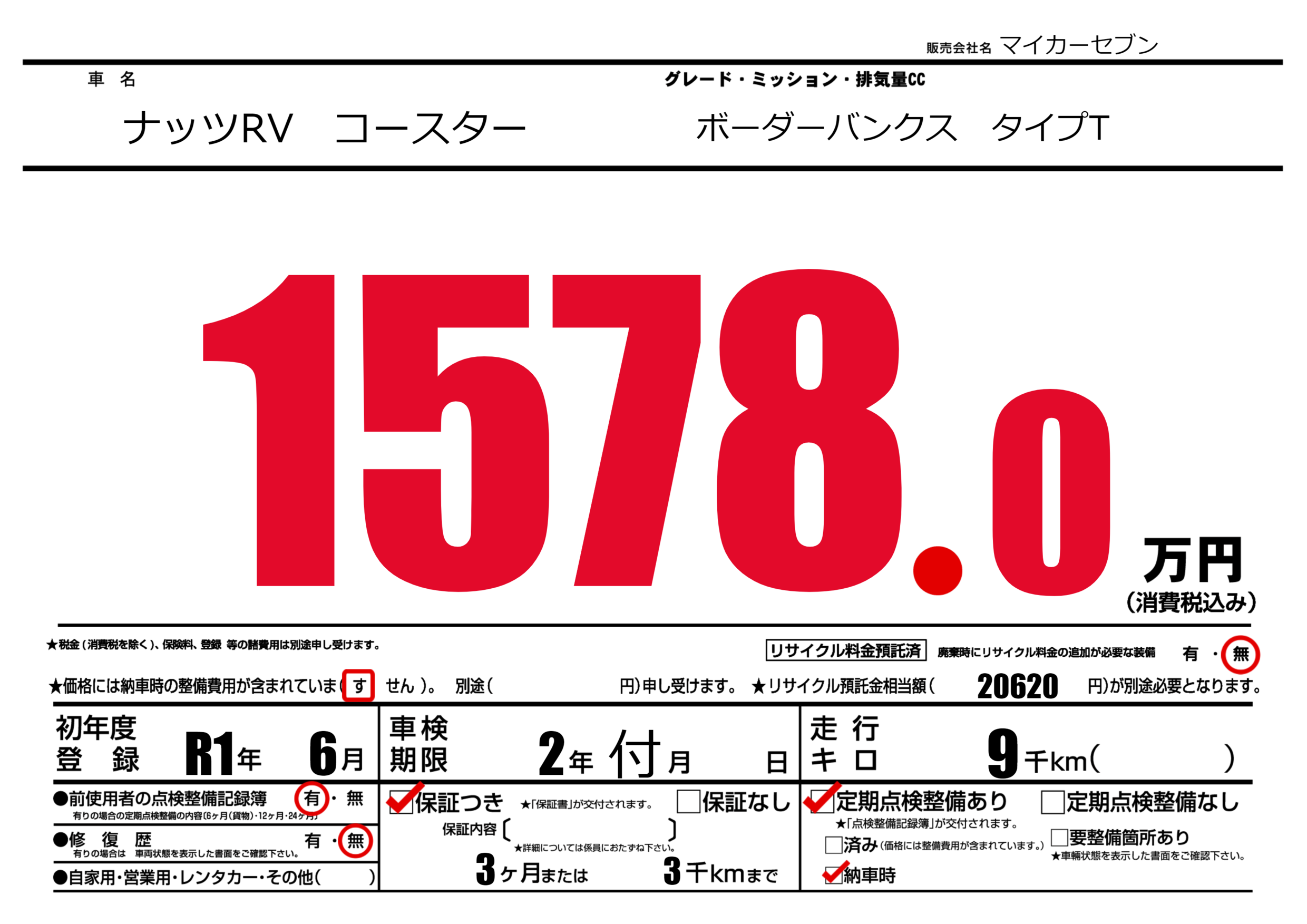 | 車名 | ナッツRV コースター | グレード ミッション 排気量 |