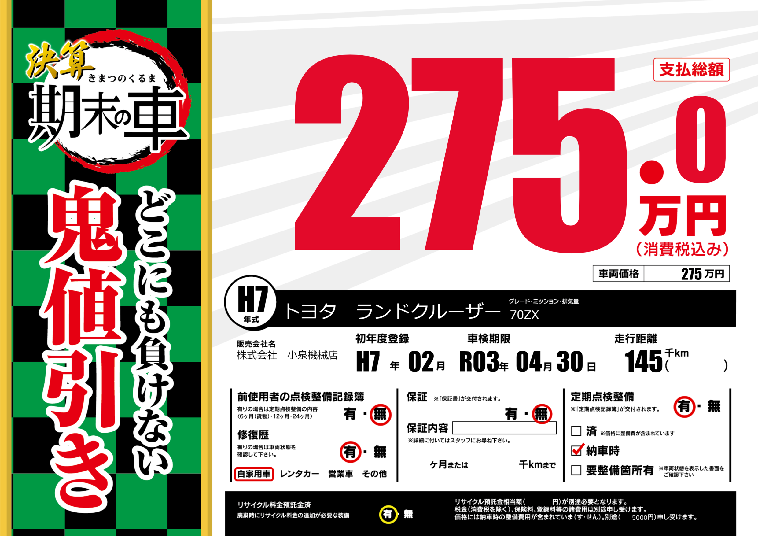 | 走行キロ | 14.5万km | 初年度登録 | H7年02月 |
