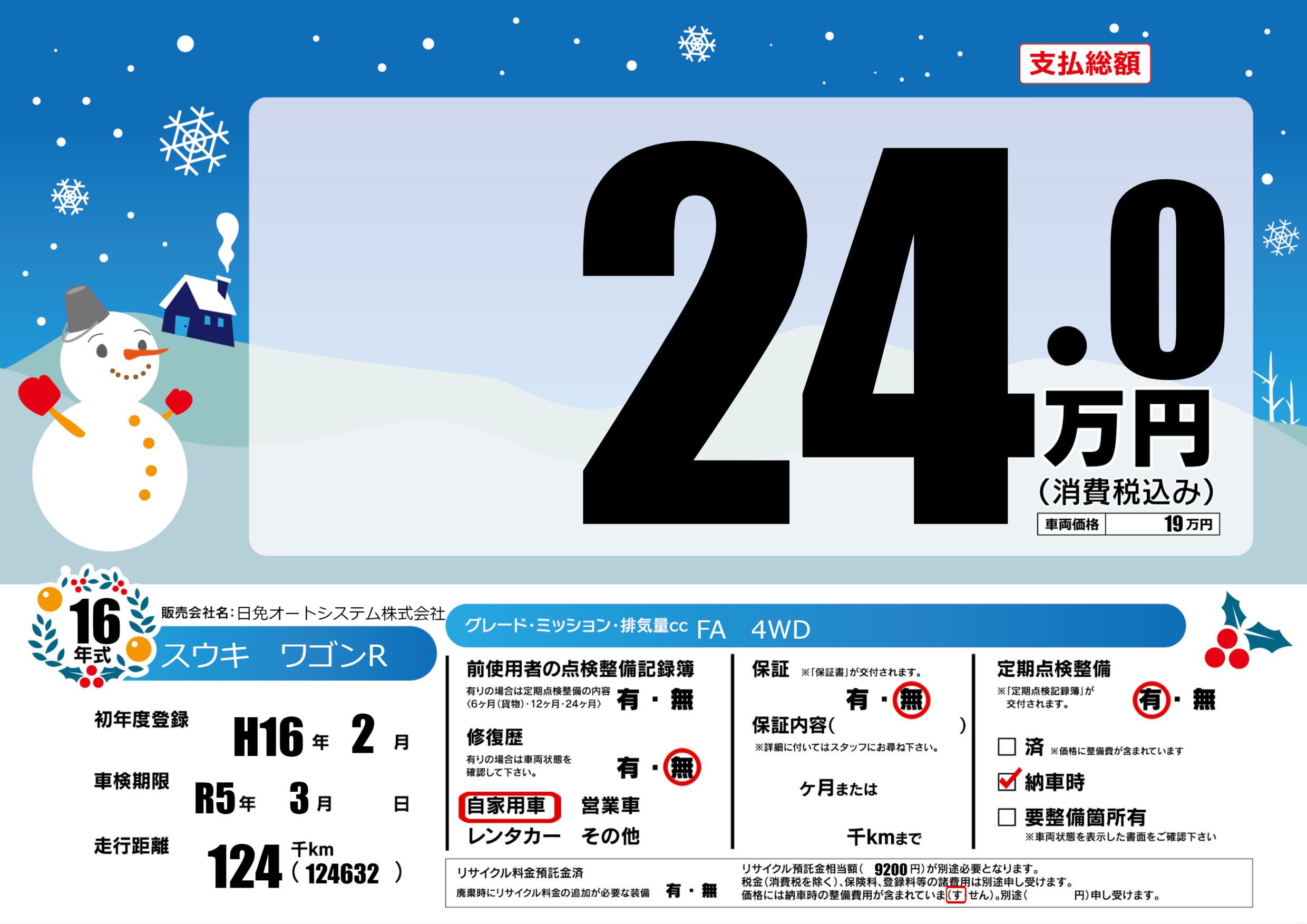 | 定期点検整備 | 定期点検整備あり 納車時あり | ||