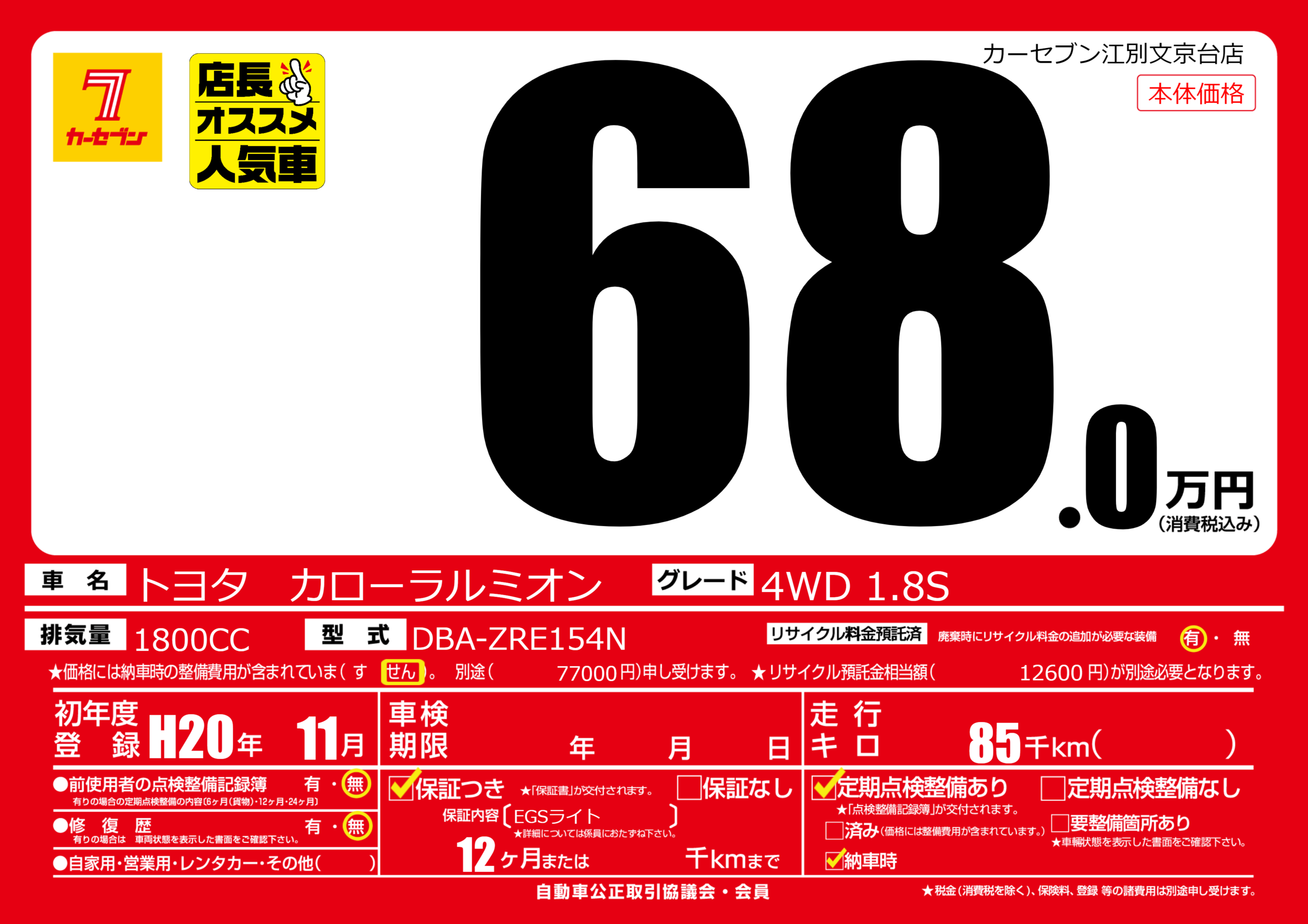 | 車名 | トヨタ カローラルミオン | グレード ミッション 排気量 |