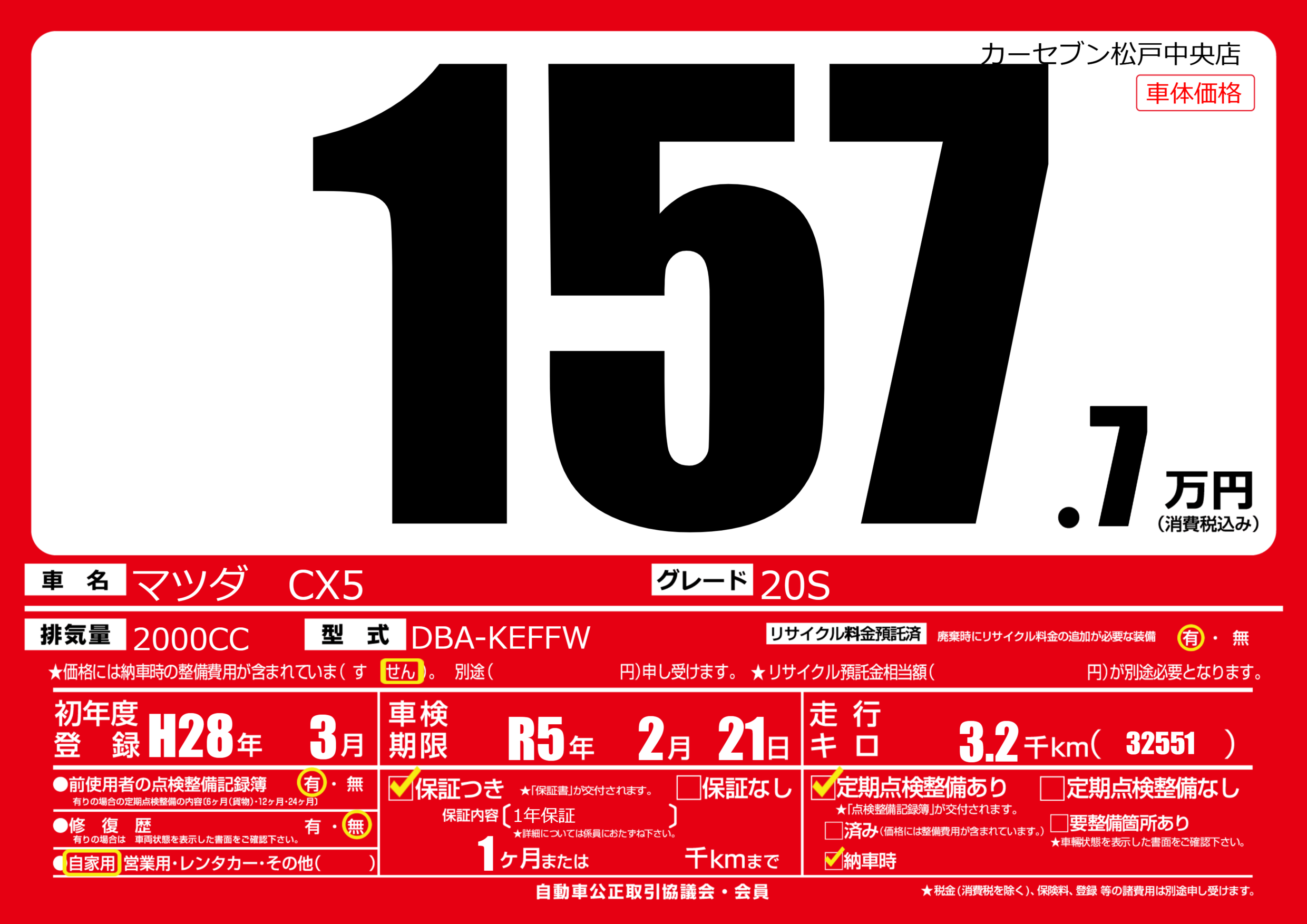 | 車名 | マツダ CX5 | グレード ミッション 排気量 |