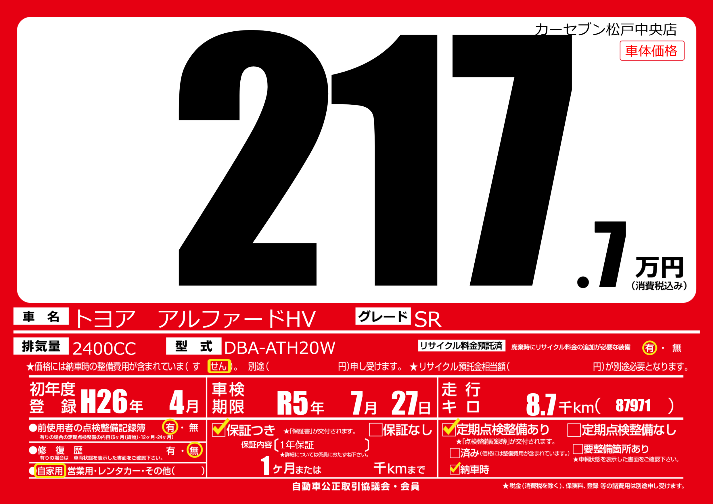 なし | 車検制限 | R5年7月27月 |