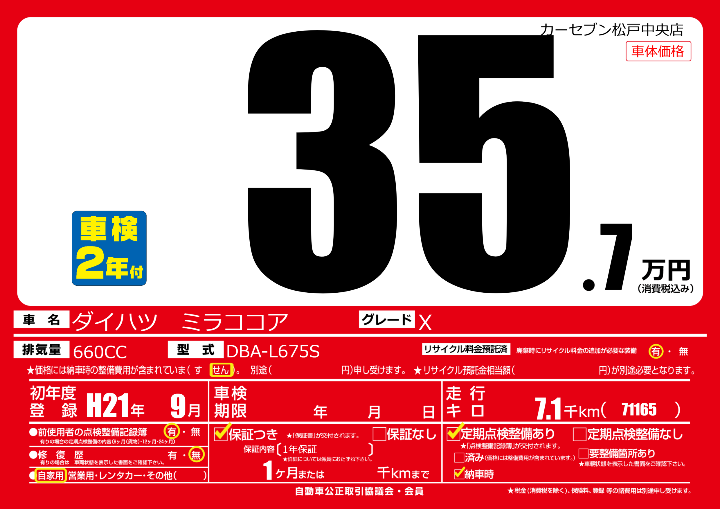 | 走行キロ | 0.7万km | 初年度登録 | H21年9月 |
