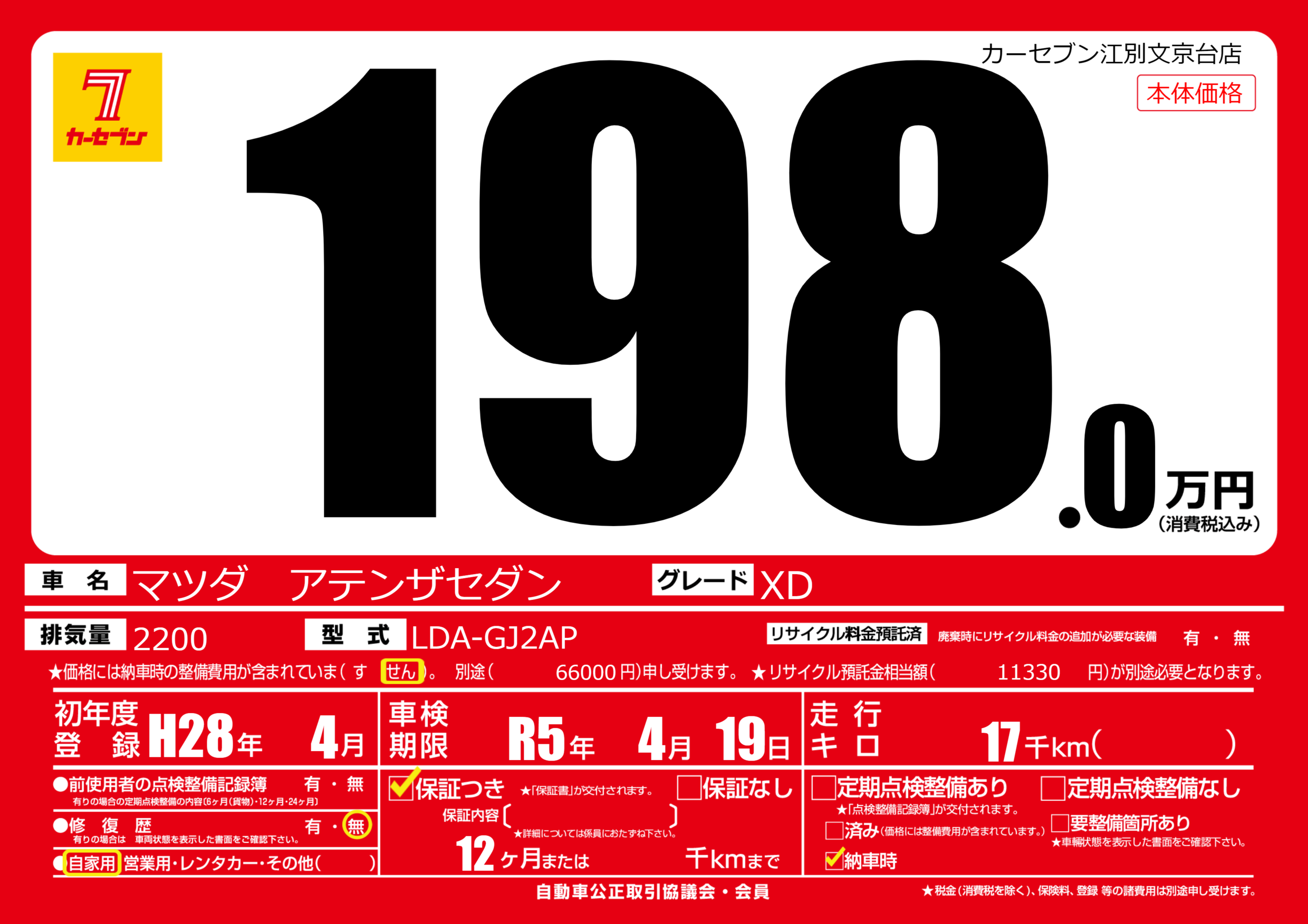 | 車名 | マツダ アテンザセダン | グレード ミッション 排気量 |