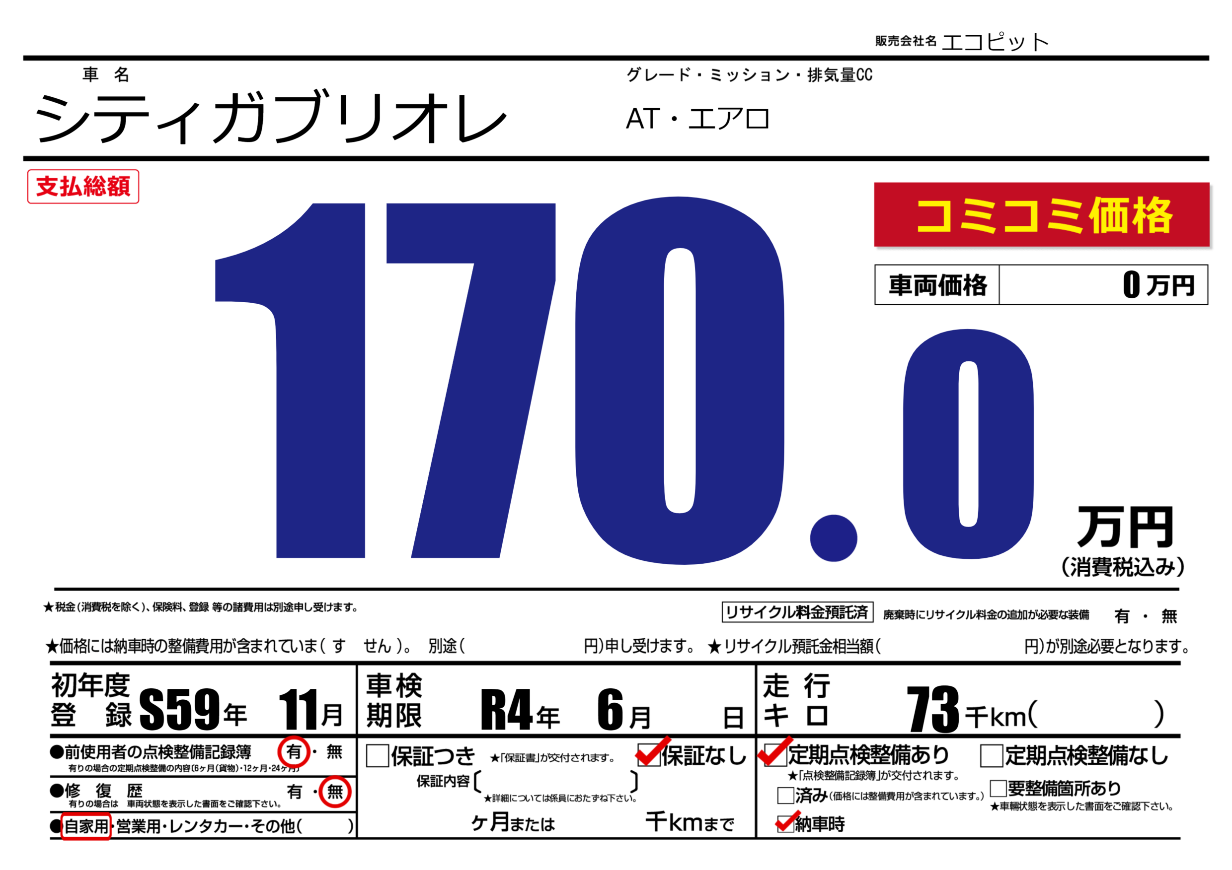 なし | 車検制限 | R4年6月---月 |