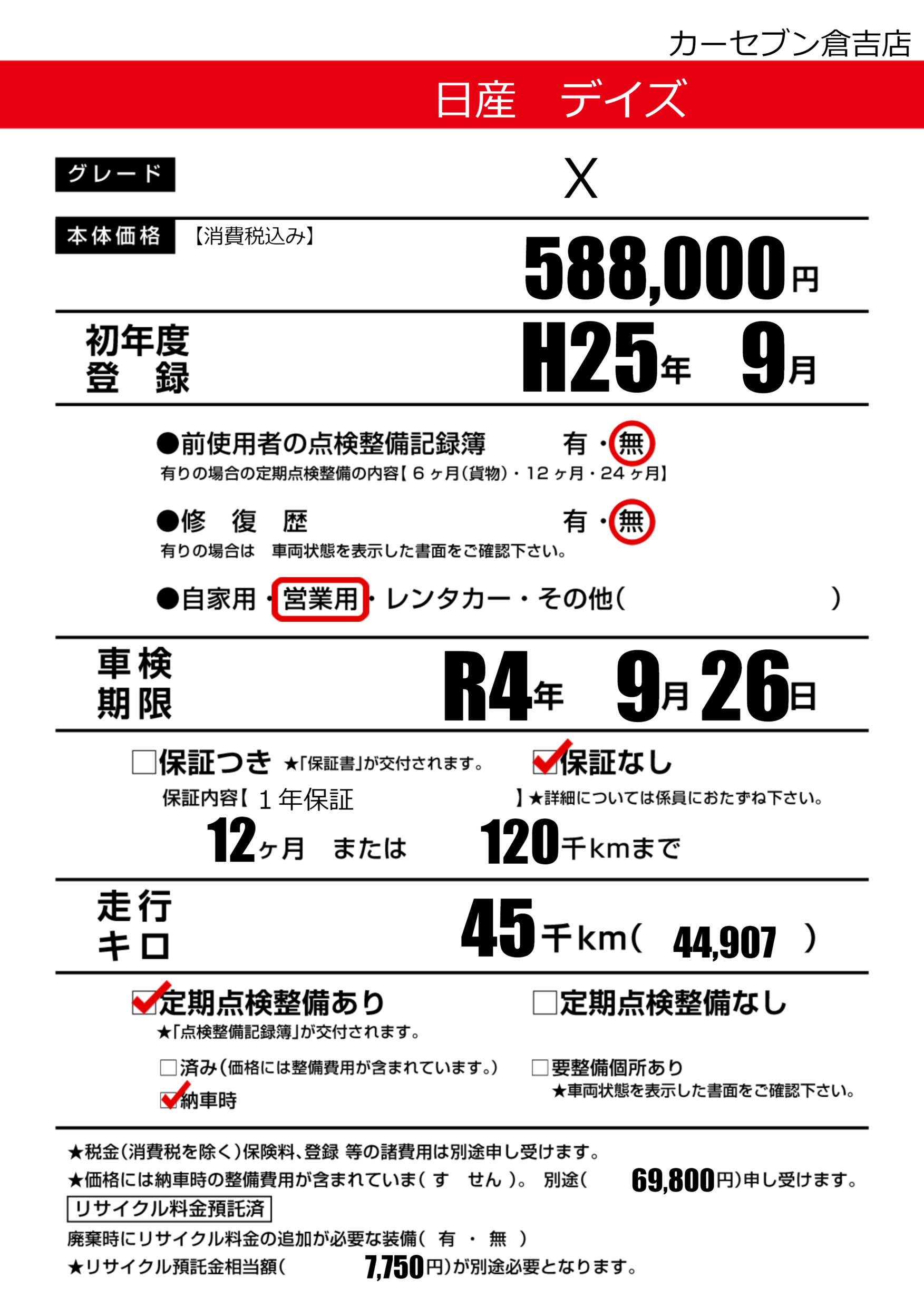| 車名 | 日産 デイズ | グレード ミッション 排気量 |