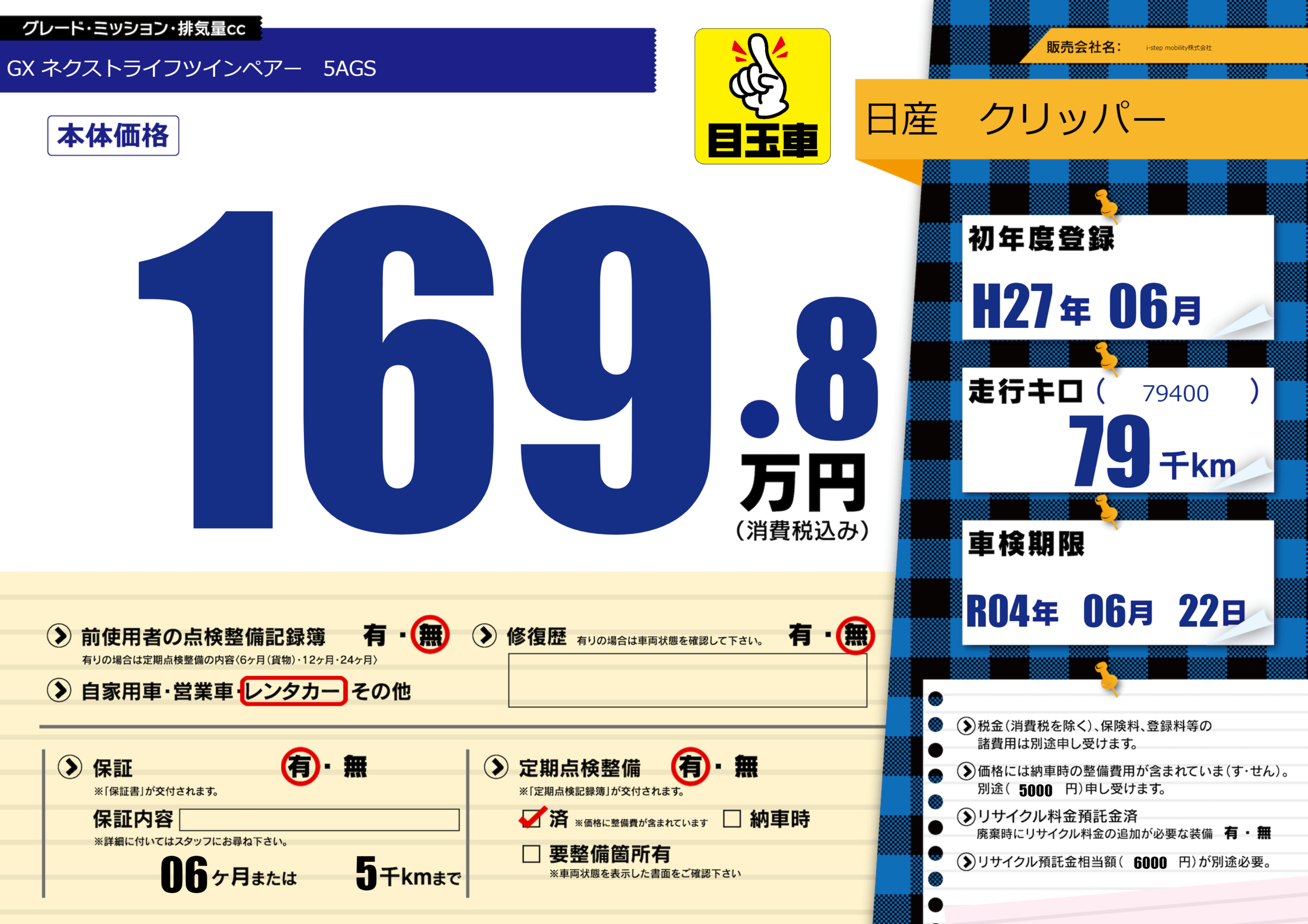 保証付き 保証内容(---) 06ヶ月または(5)千kmまで |
