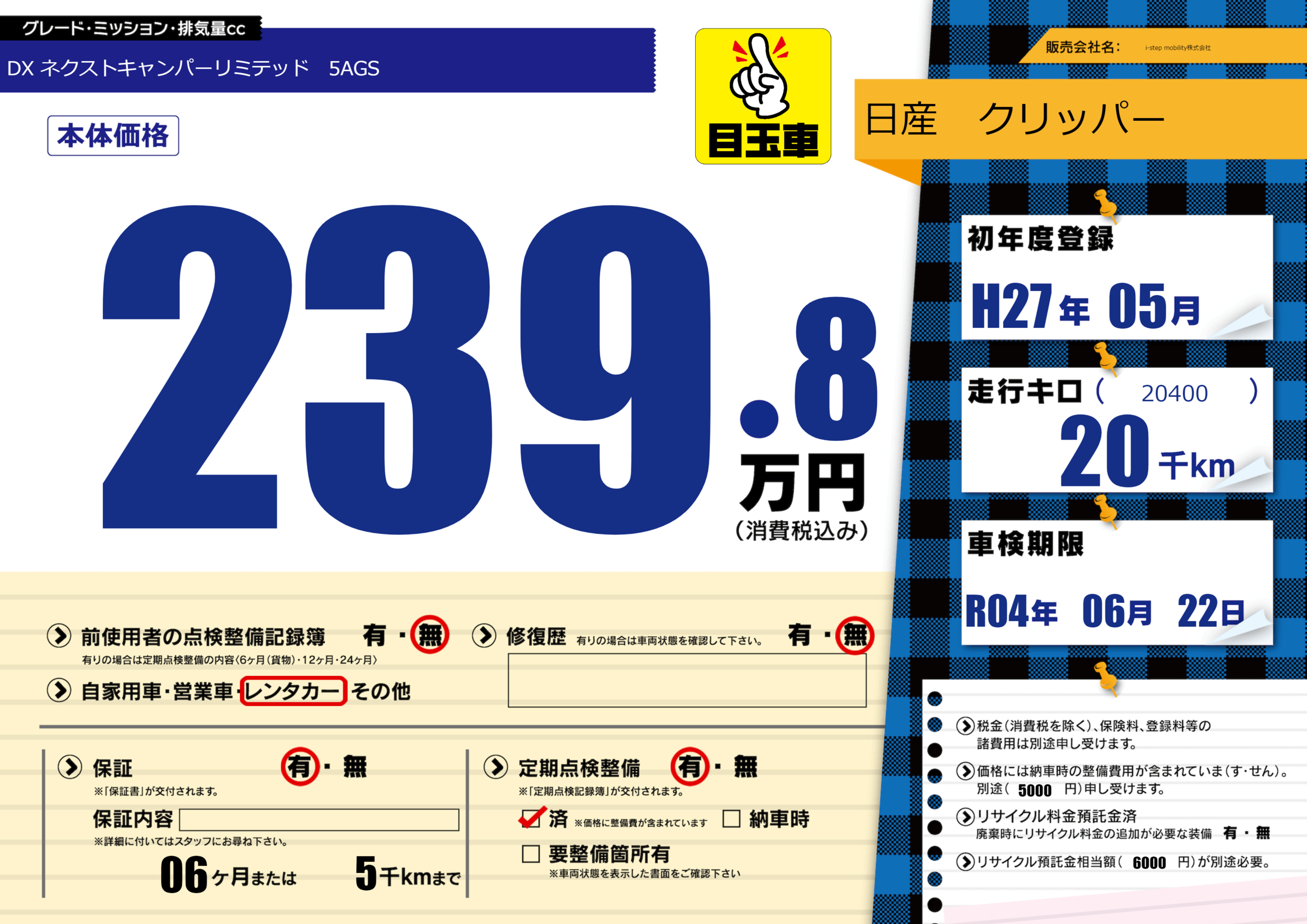 | 定期点検整備 | 定期点検整備あり 定期点検整備済み | ||