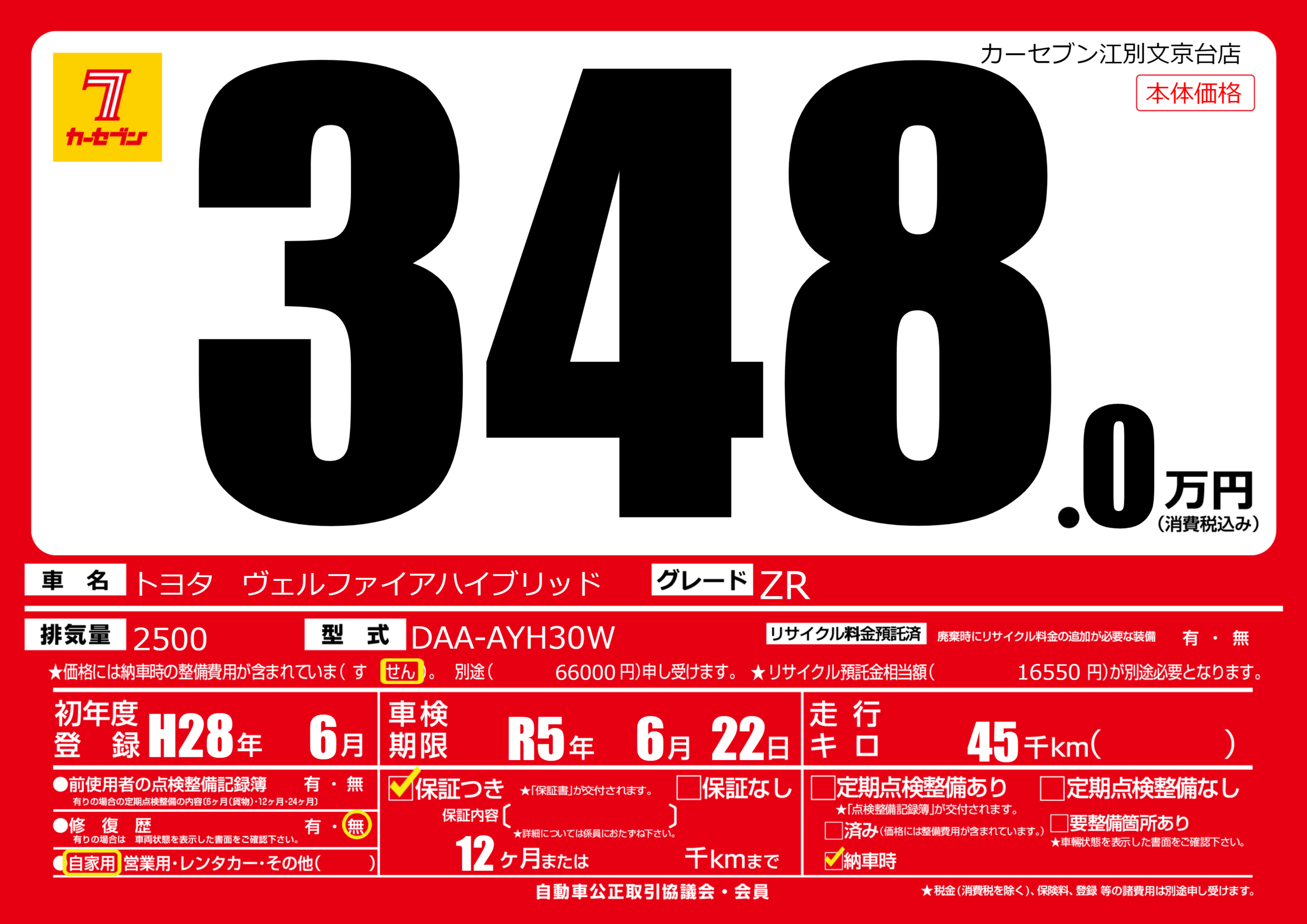 | 車名 | トヨタ ヴェルファイアハイブリッド | グレード ミッション 排気量 |