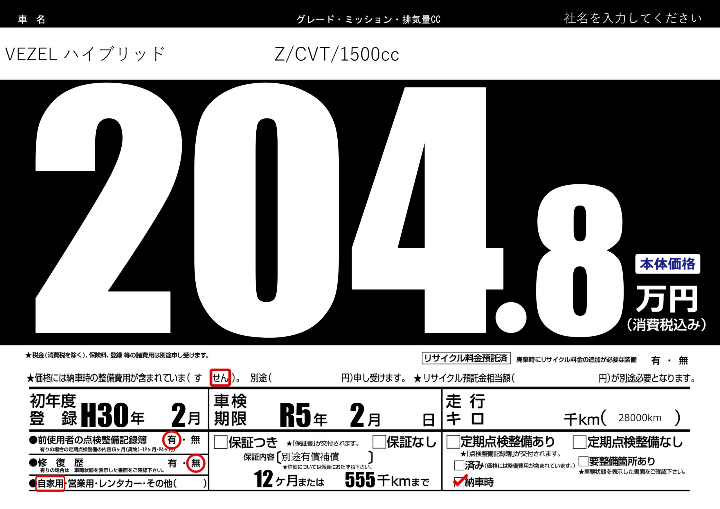 | 車検制限 | R5年 2月 - 日 | ||